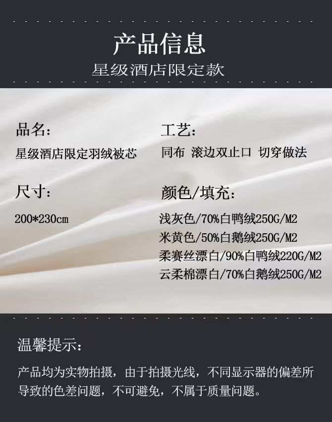 商品名称:安力森/诚臻酒店用品 2025新款羽绒被芯100白鹅绒星级酒店专用羽绒被国家标准真羽绒被假一赔十 90%白鸭绒220G/M2