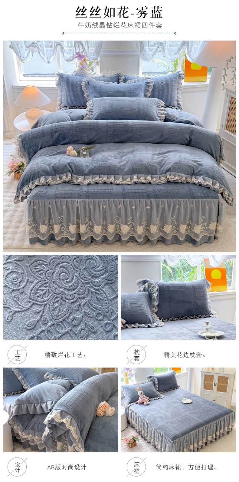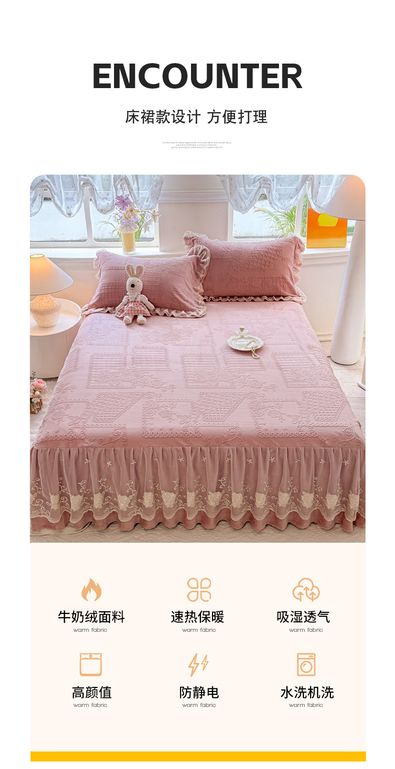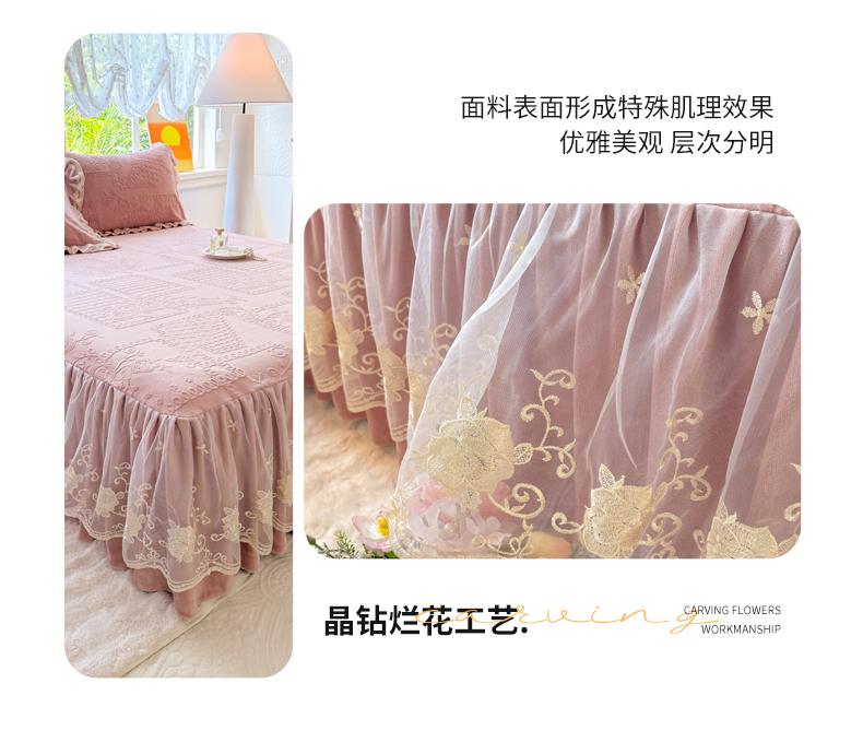 当前位置: 91家纺网 > 商品网购 > 床品套件 > 四件套 > 牛奶绒四件套 > 美达家纺 2025新款牛奶绒雕花系列床裙四件套 床裙-丝丝如花-皮粉