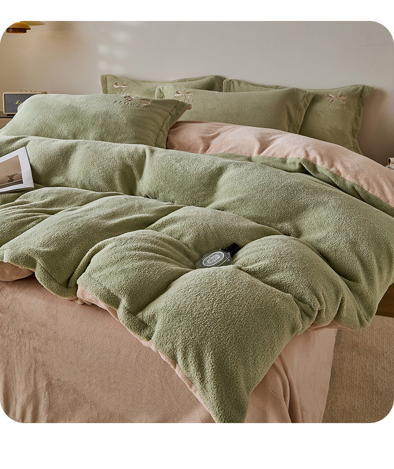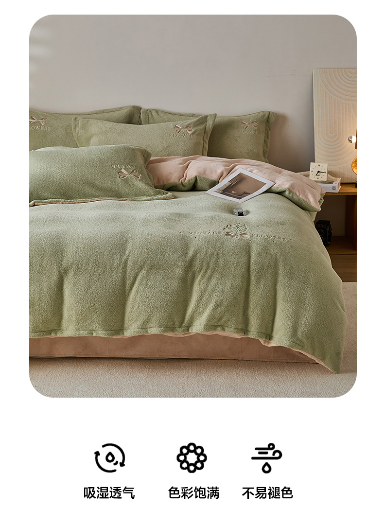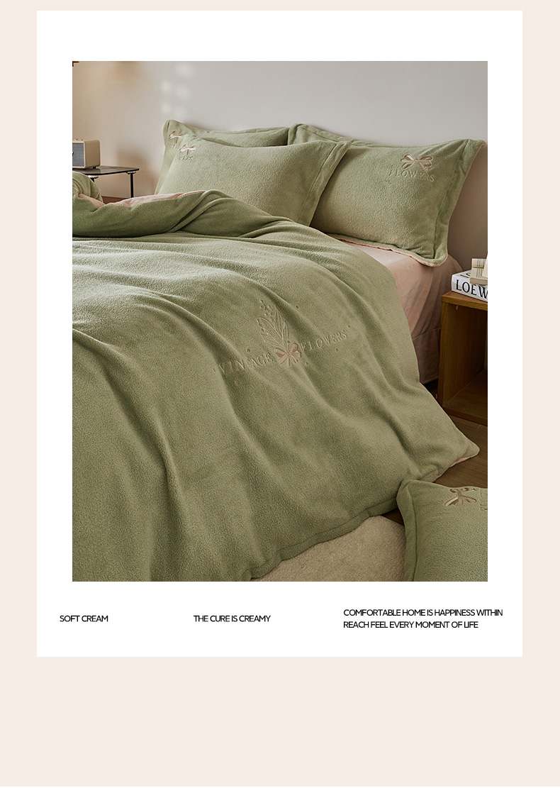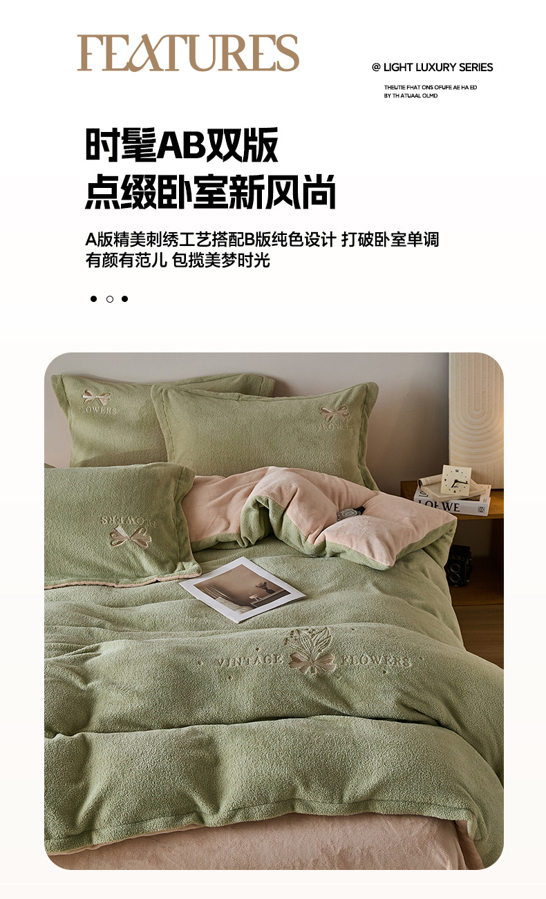 • 91家纺网 家纺一手货源 找家纺 锦罗绣 2025新款雪尼绒艾尼绒230克全消光绣花系列单被套 果绿+卡其