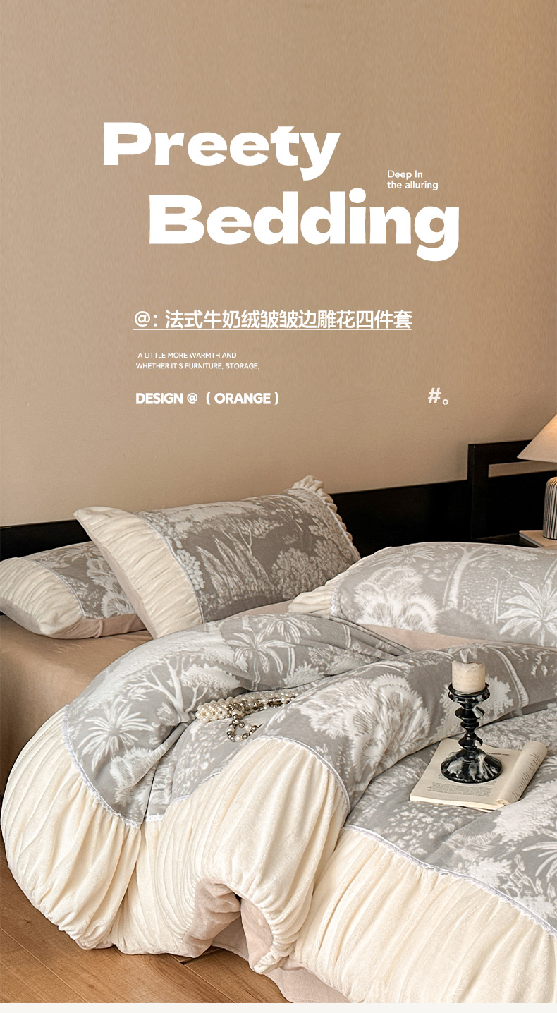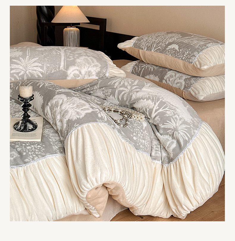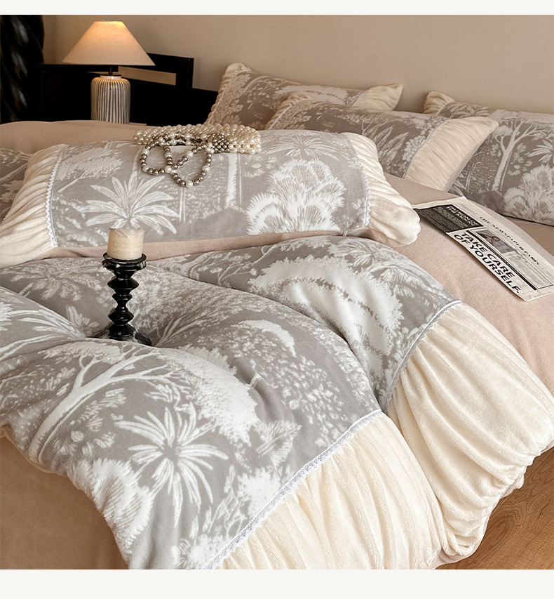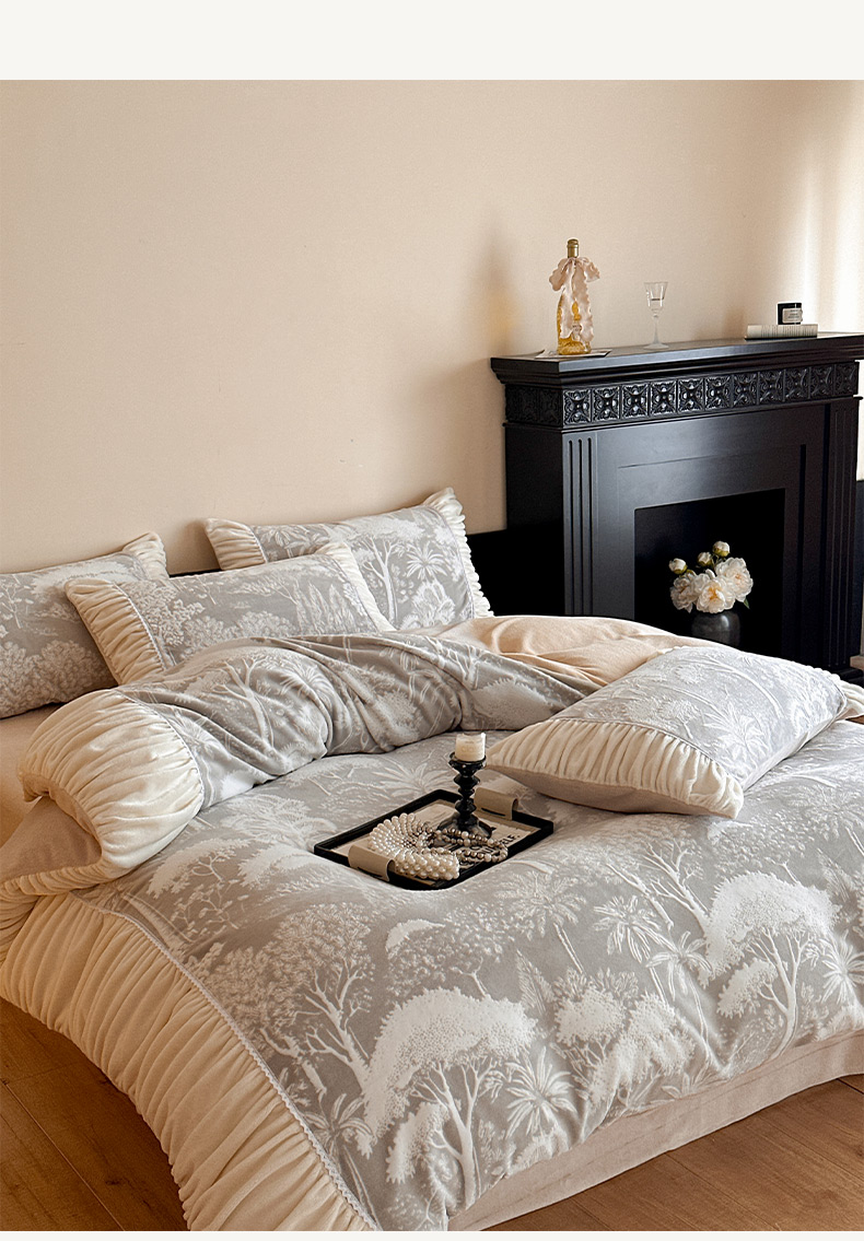 商品名称:索飞特家纺 2025新款秋冬法式牛奶绒皱皱边雕花四件套 杏花烟雨-灰驼