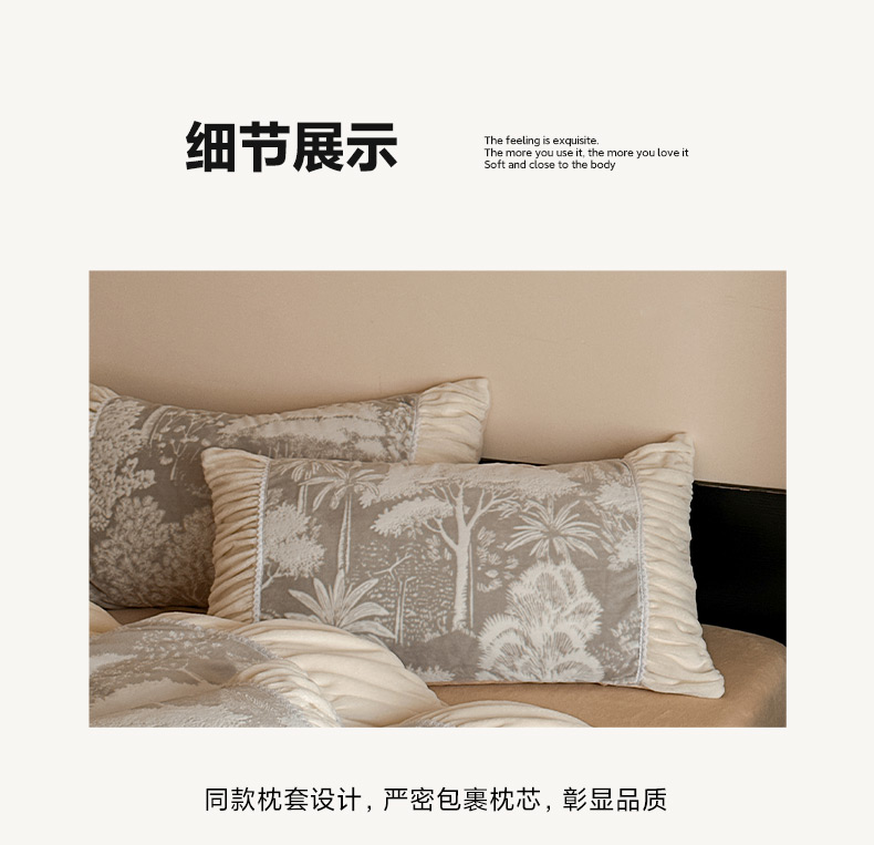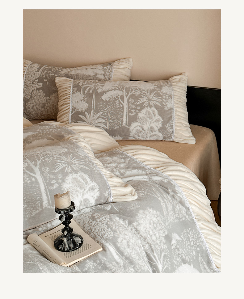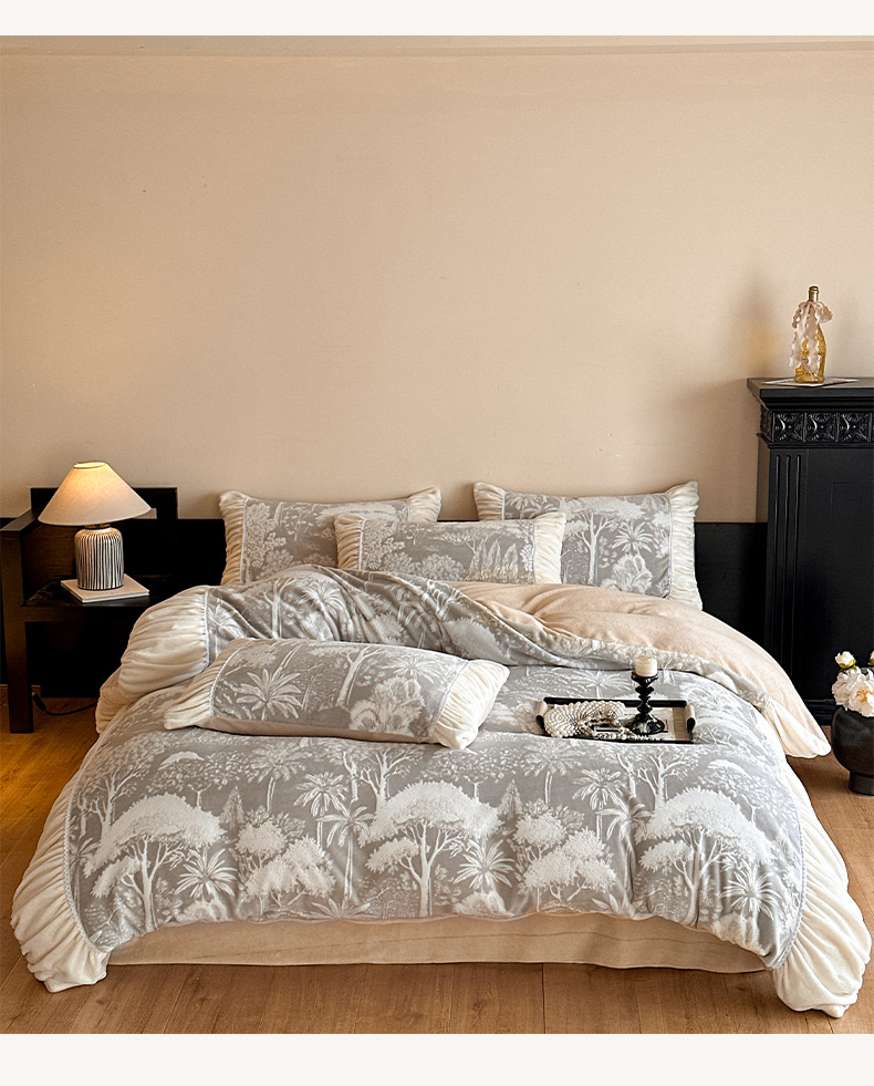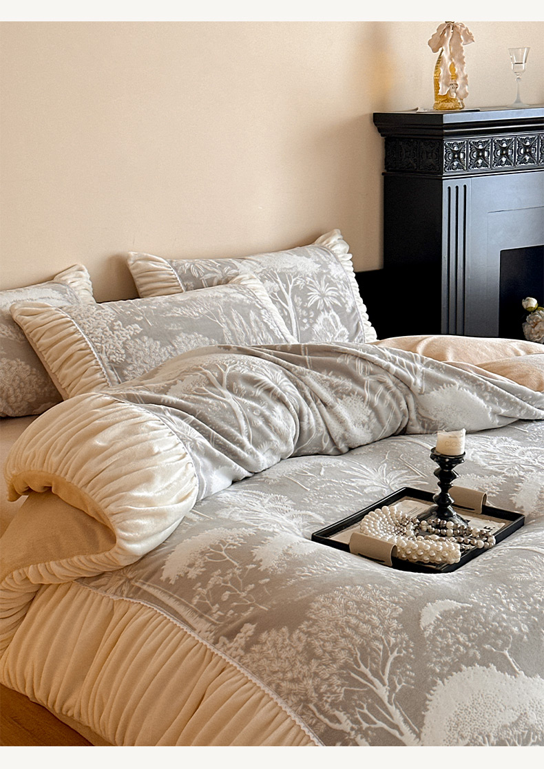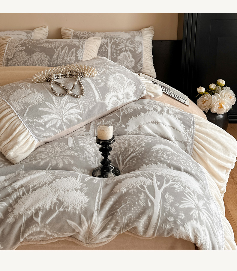 商品名称:索飞特家纺 2025新款秋冬法式牛奶绒皱皱边雕花四件套 杏花烟雨-灰驼