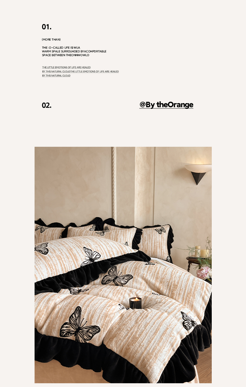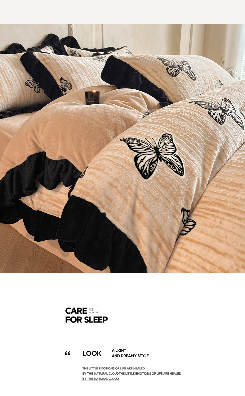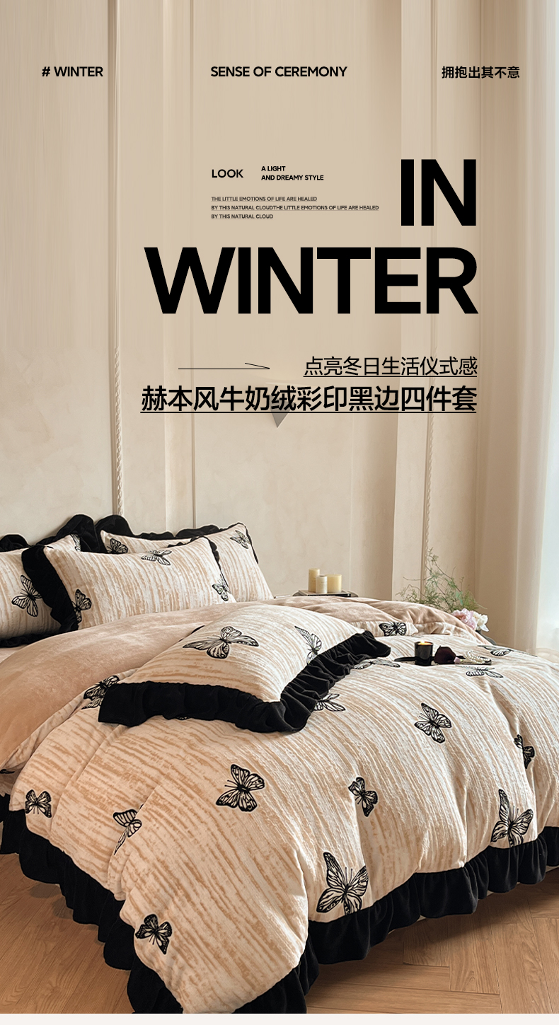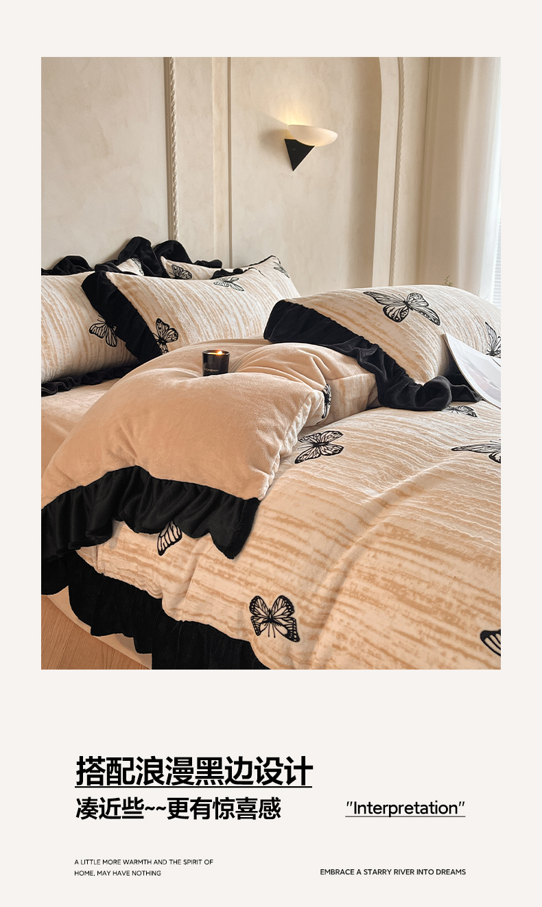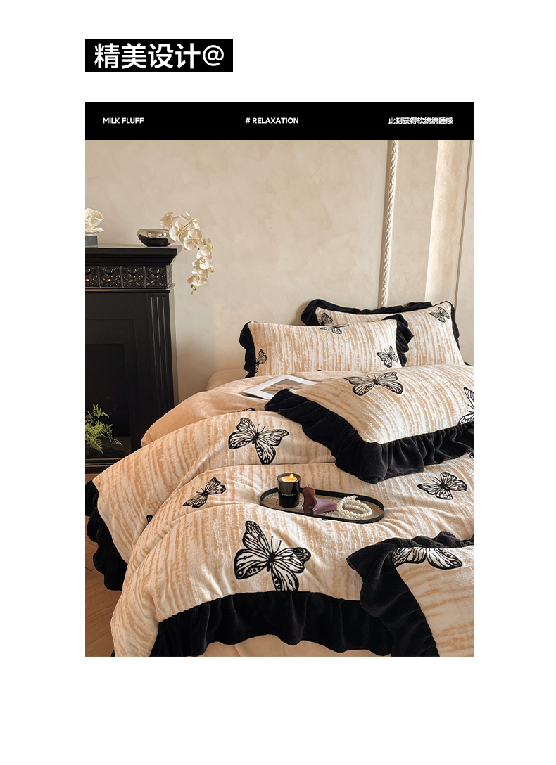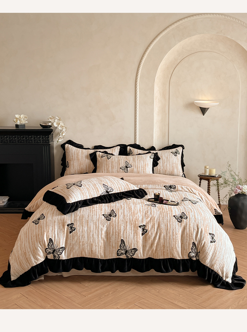 商品名称:索飞特家纺 2025新款秋冬赫本风牛奶绒彩印黑边四件套 玉蝴蝶-卡其