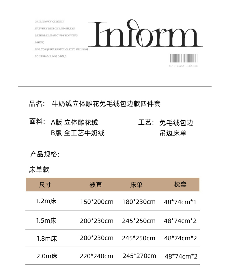 商品名称:(总)鹿辉家居(原吉欧力) 2025新款牛奶绒8.5斤立体雕花兔毛绒包边四件套
