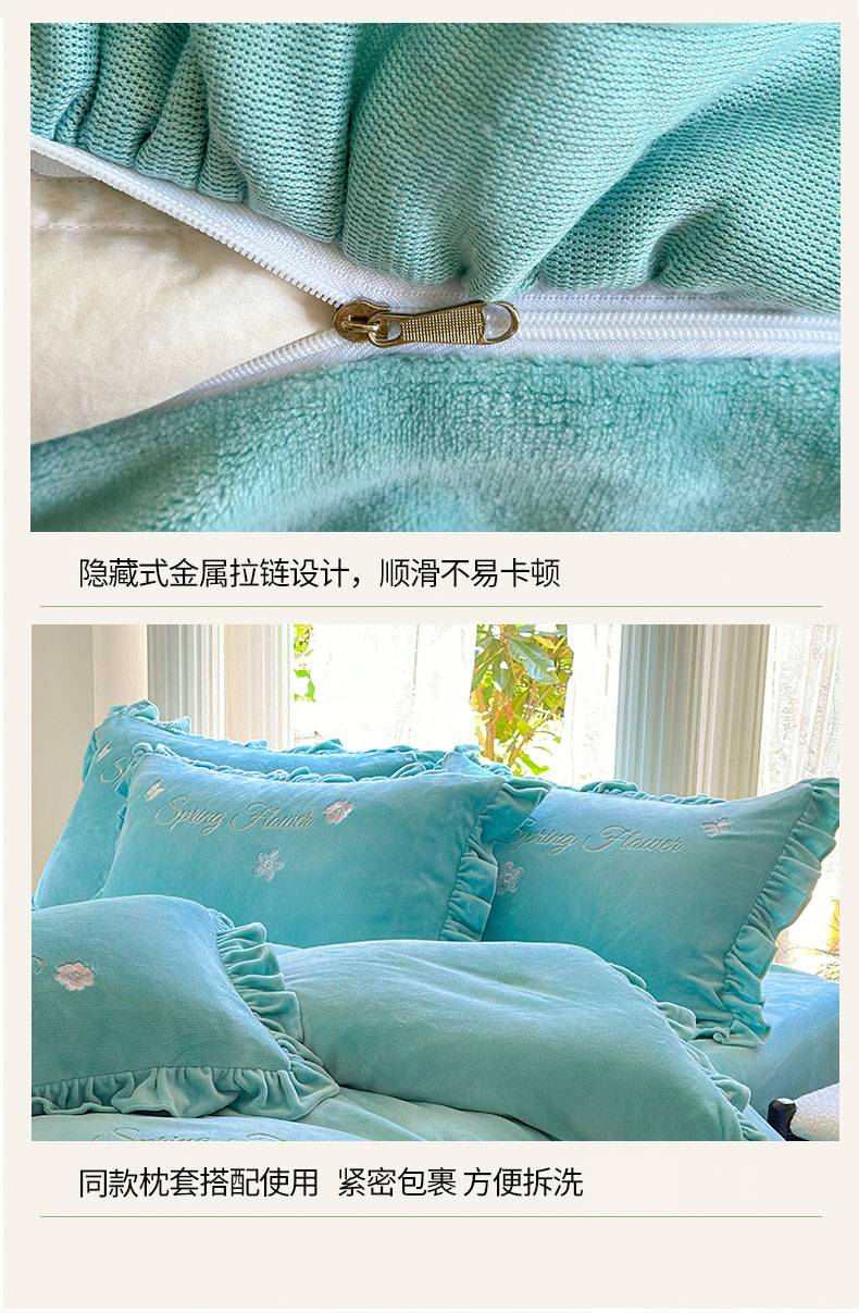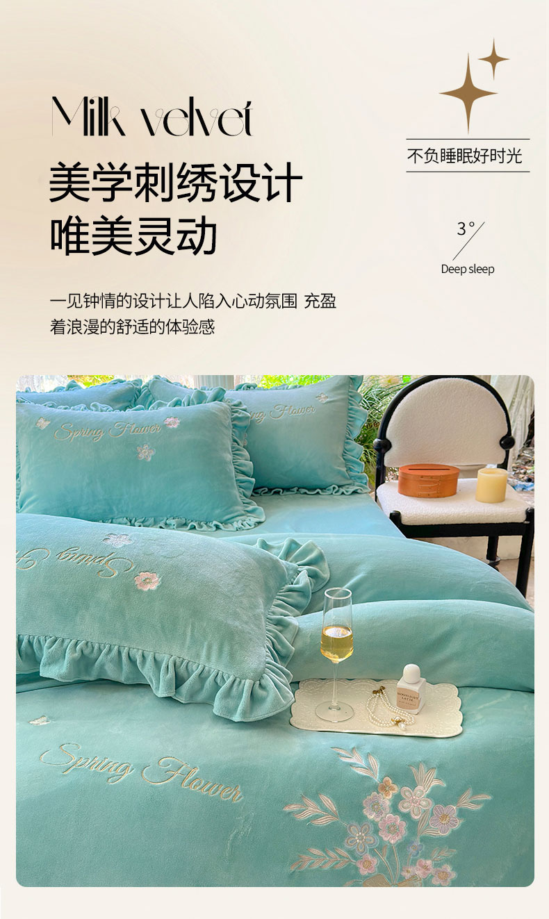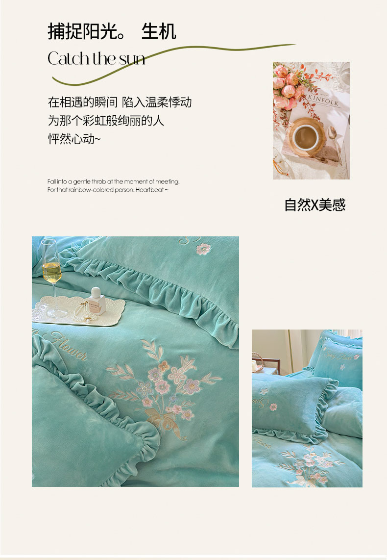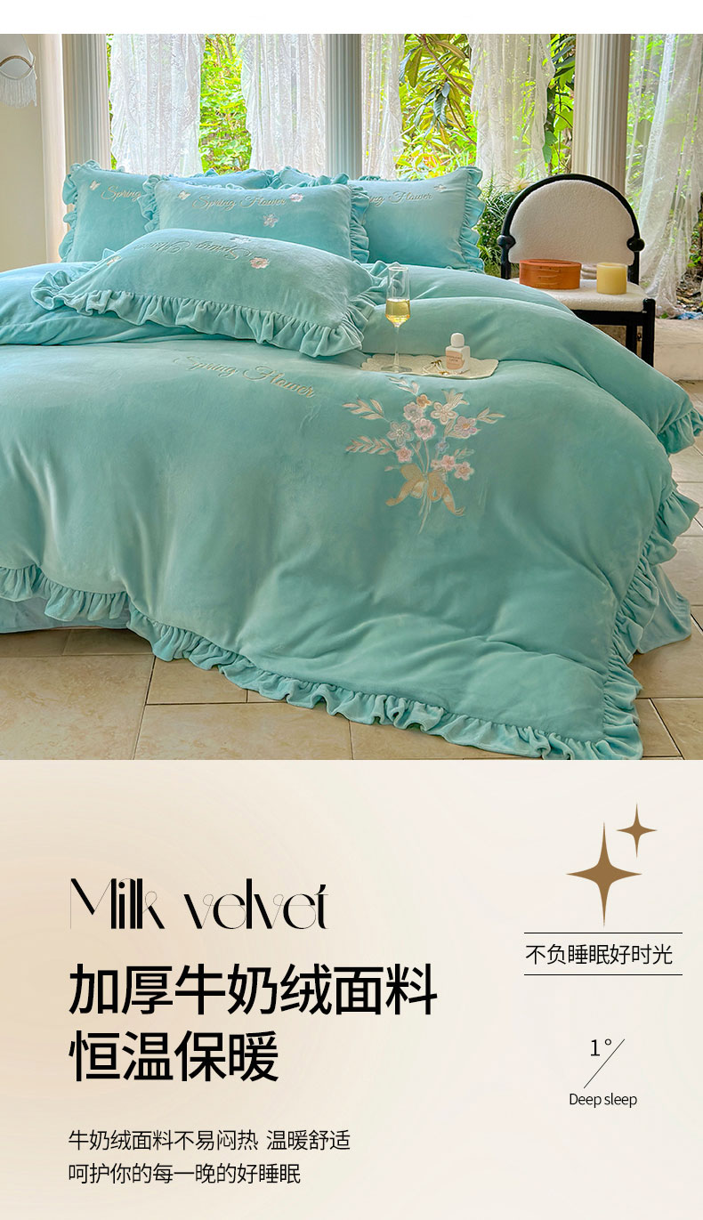 美洲琳 2025新款高克重牛奶绒绣花四件套 手捧花-湖蓝
