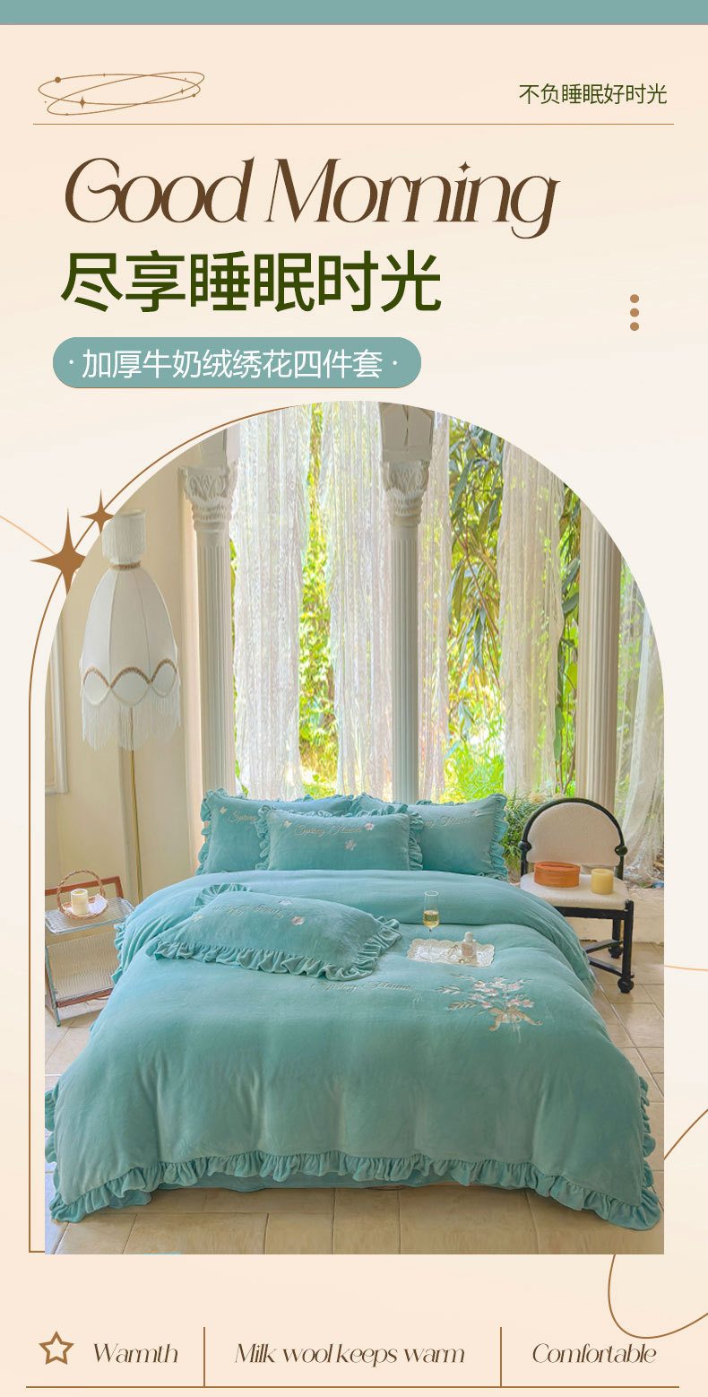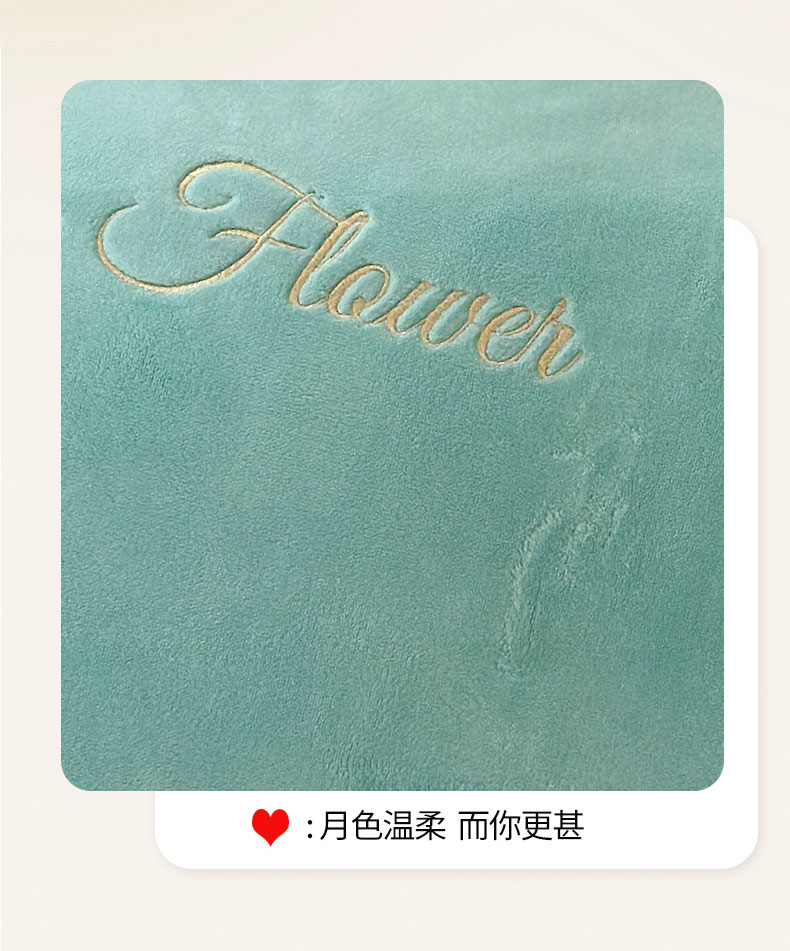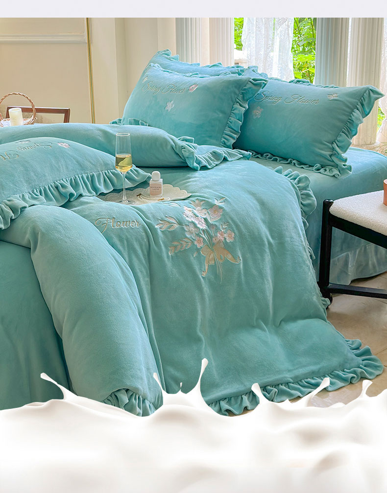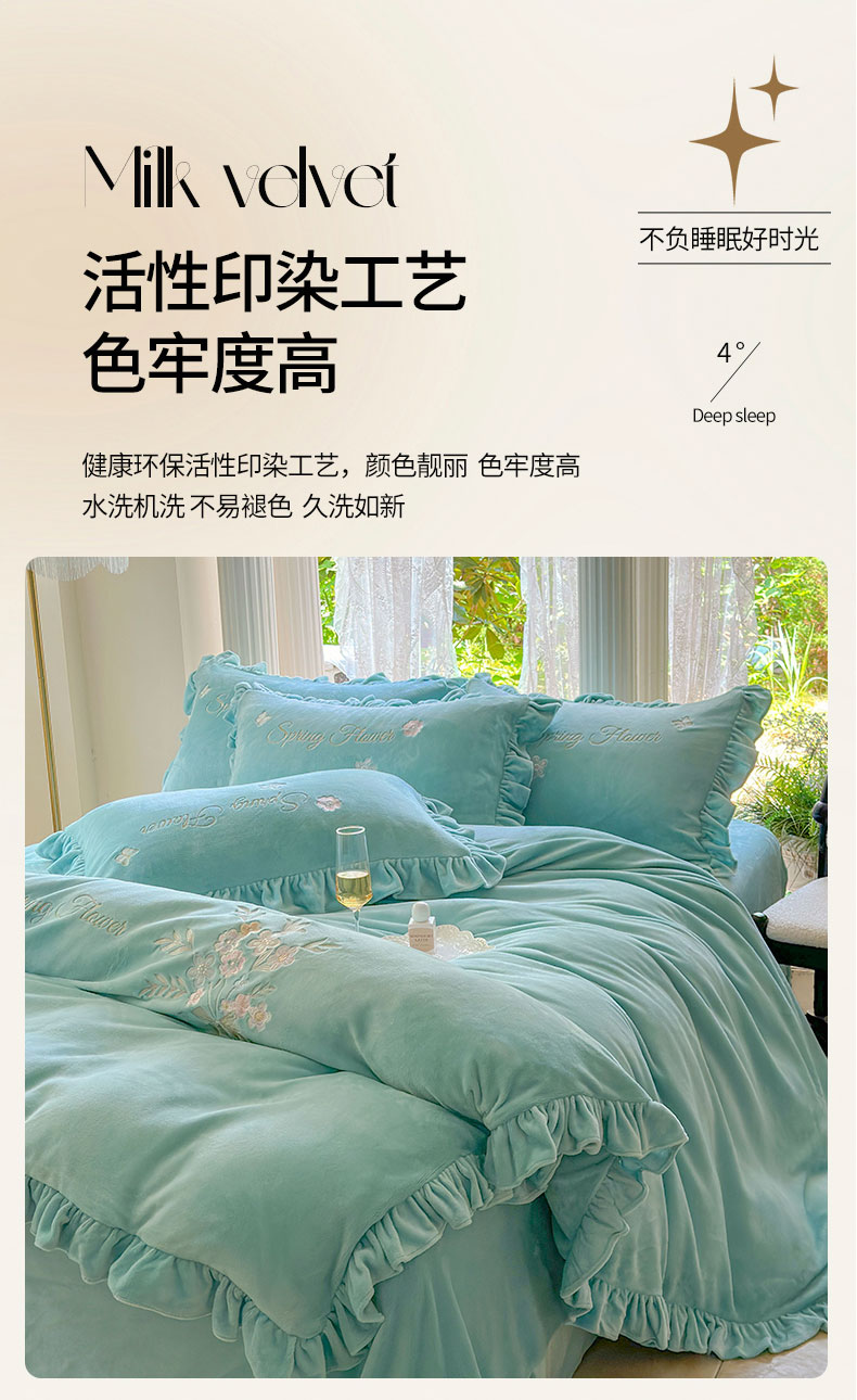 美洲琳 2025新款高克重牛奶绒绣花四件套 手捧花-湖蓝