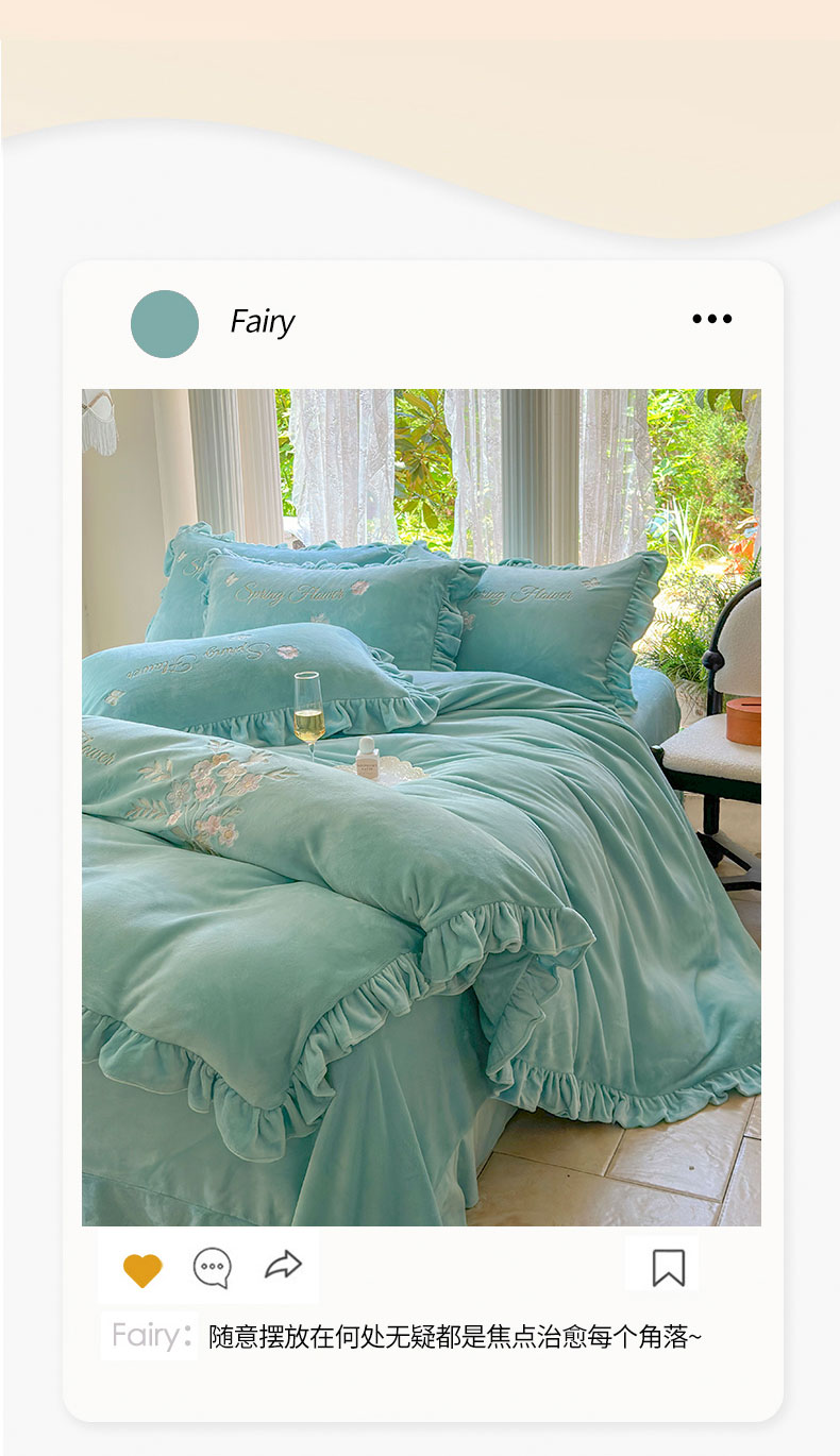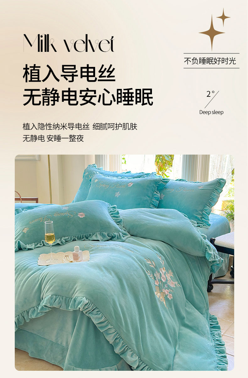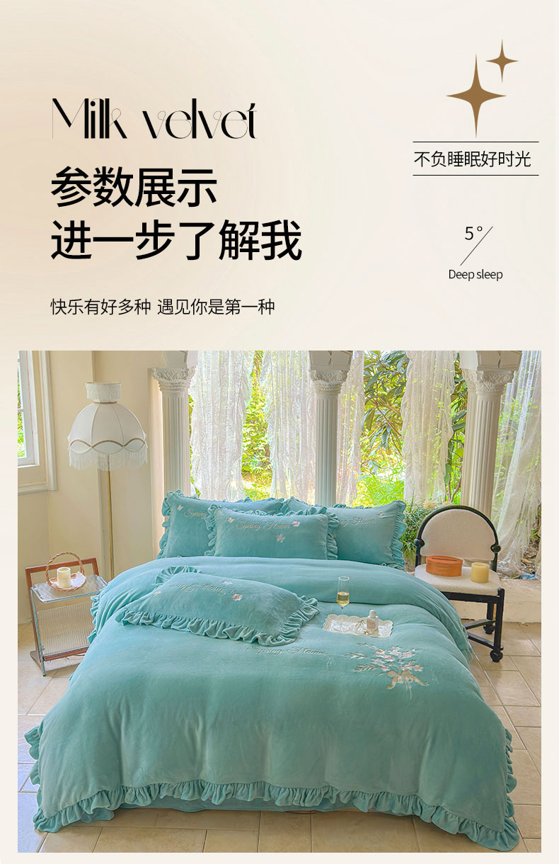 商品名称:美洲琳 2025新款高克重牛奶绒绣花四件套 手捧花-湖蓝