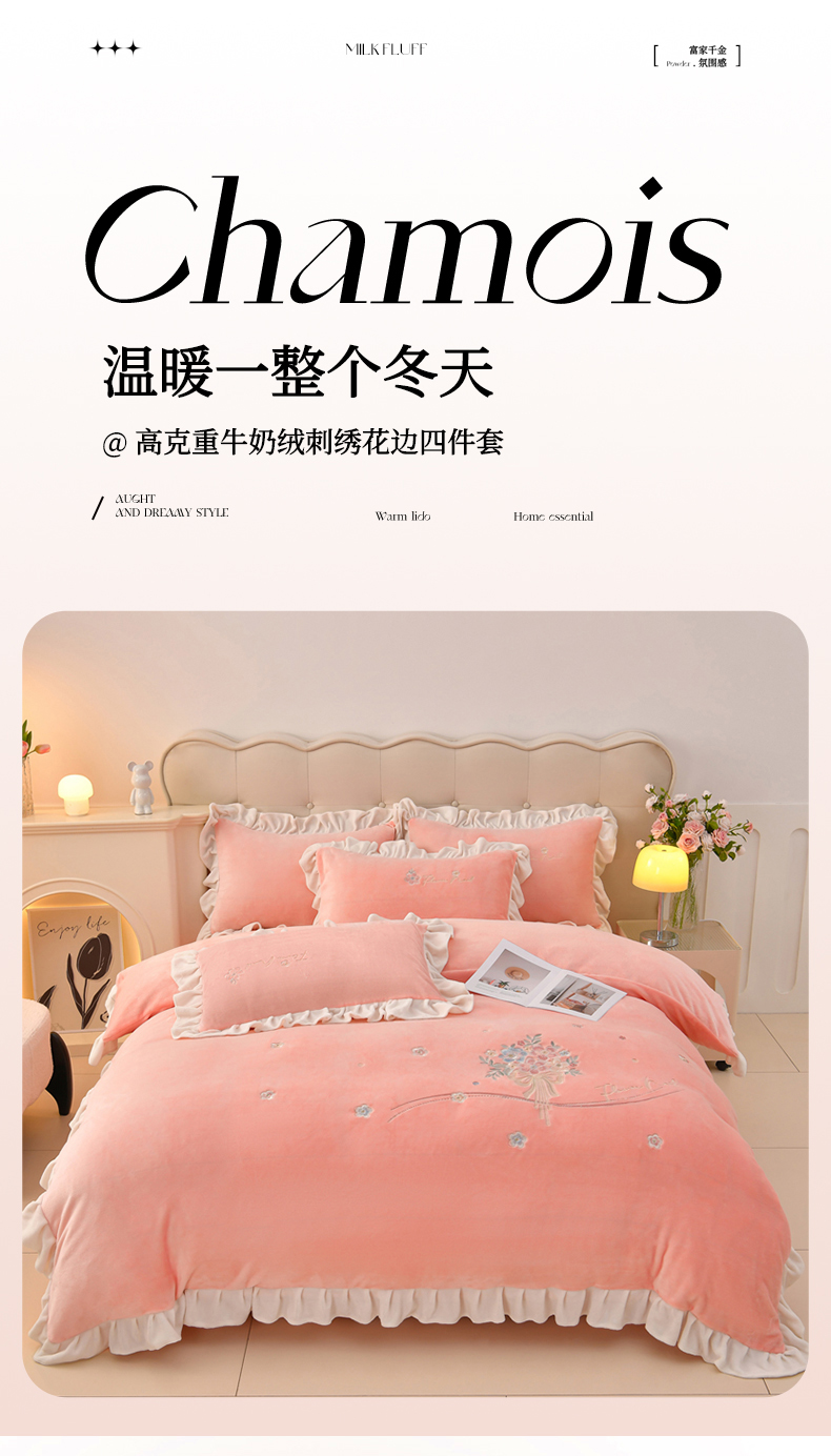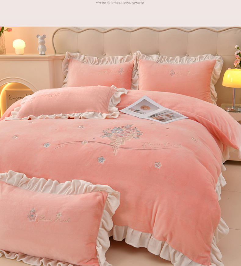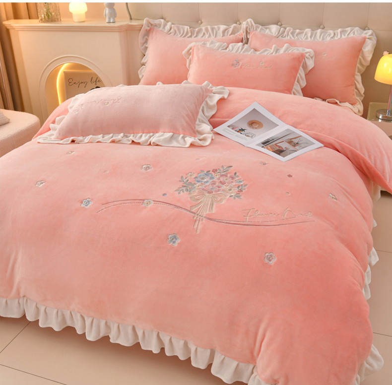 畅畅家纺 2025新款亲肤舒适冬季刺绣花边保暖牛奶绒四件套-花束 花束-粉