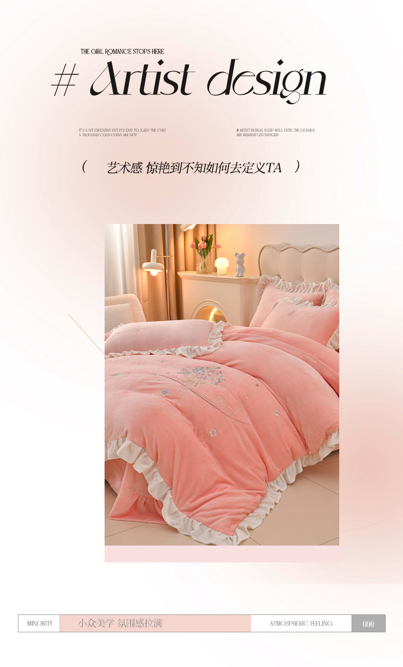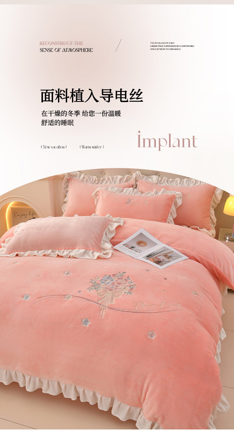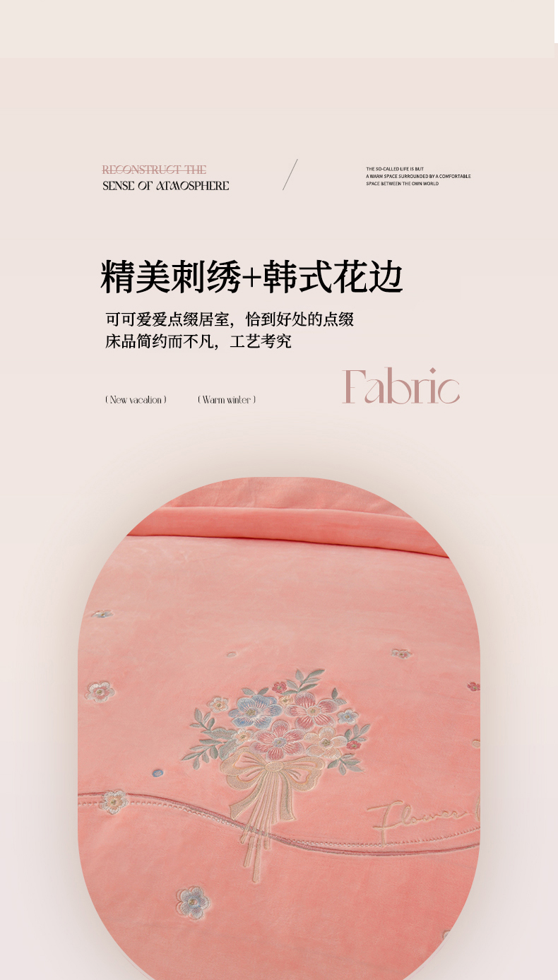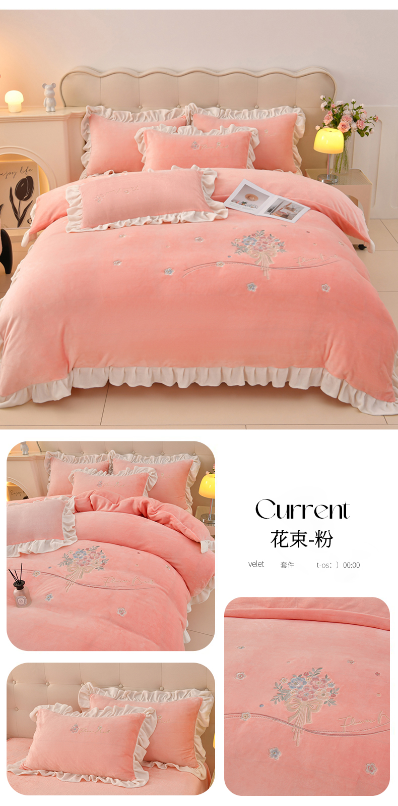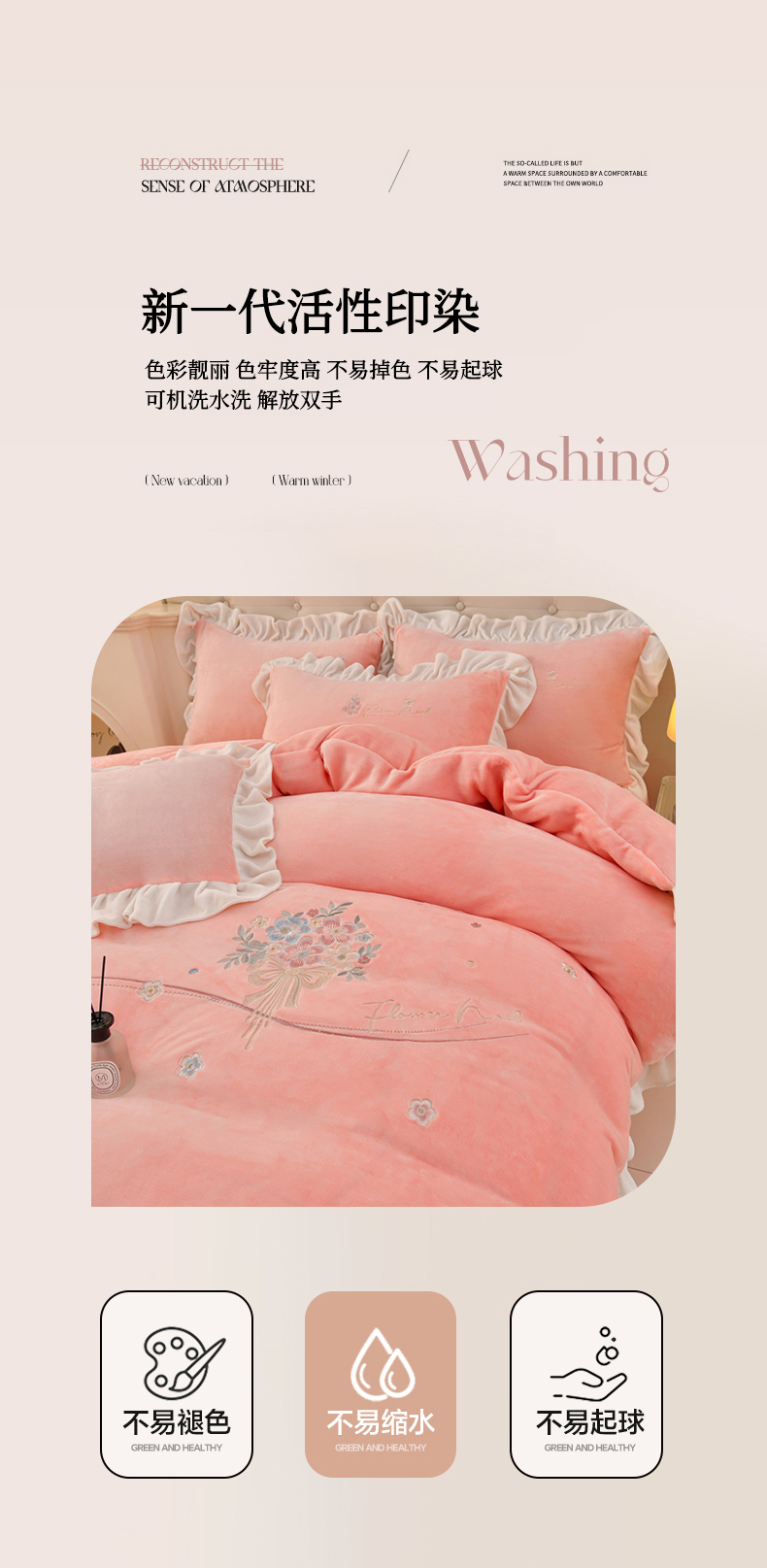 商品名称:畅畅家纺 2025新款亲肤舒适冬季刺绣花边保暖牛奶绒四件套-花束 花束-粉