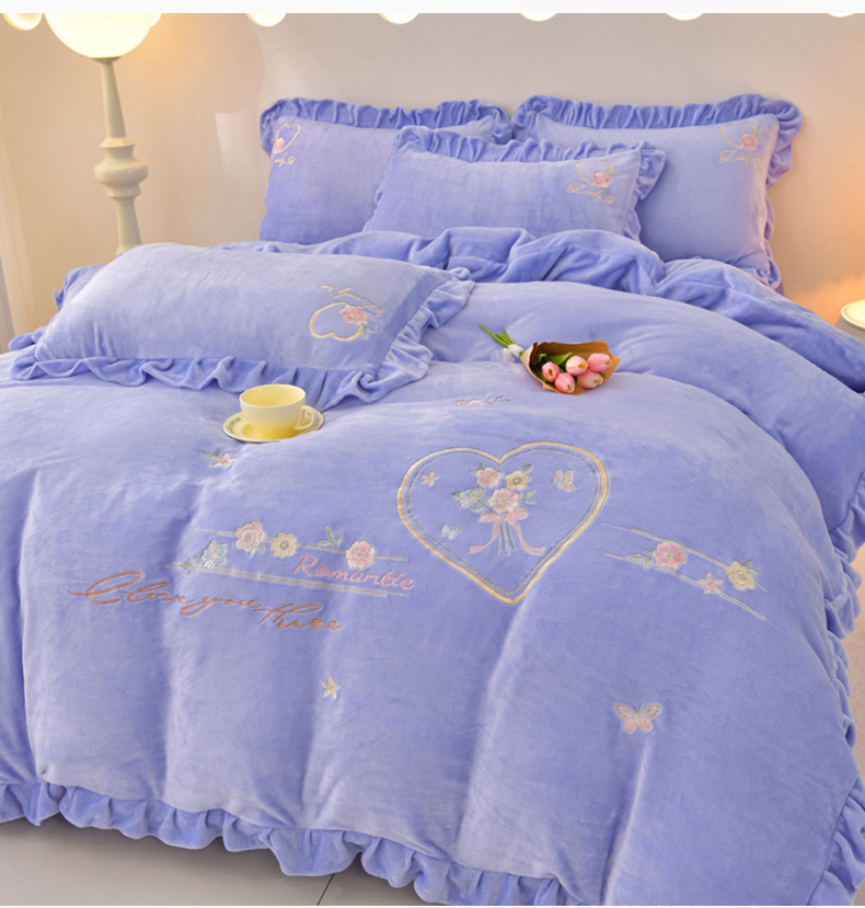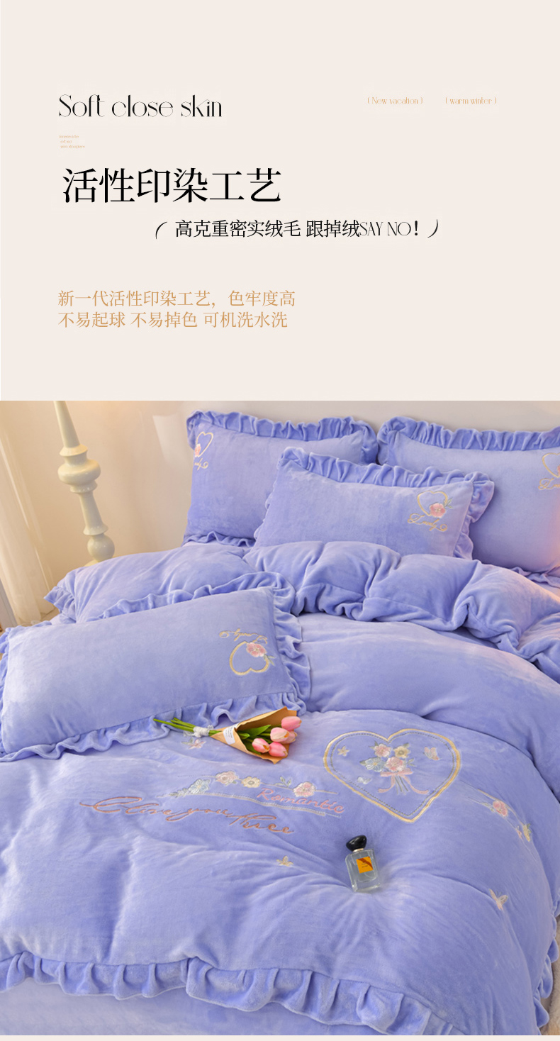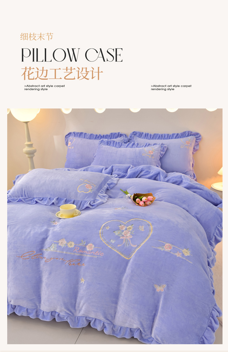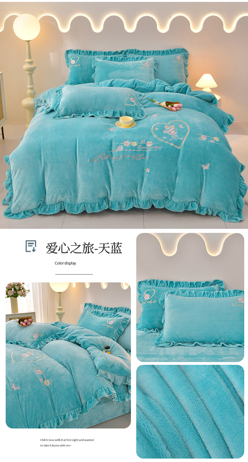 畅畅家纺 2025新款亲肤舒适冬季刺绣花边保暖牛奶绒四件套-爱心之旅 爱心之旅-淡蓝