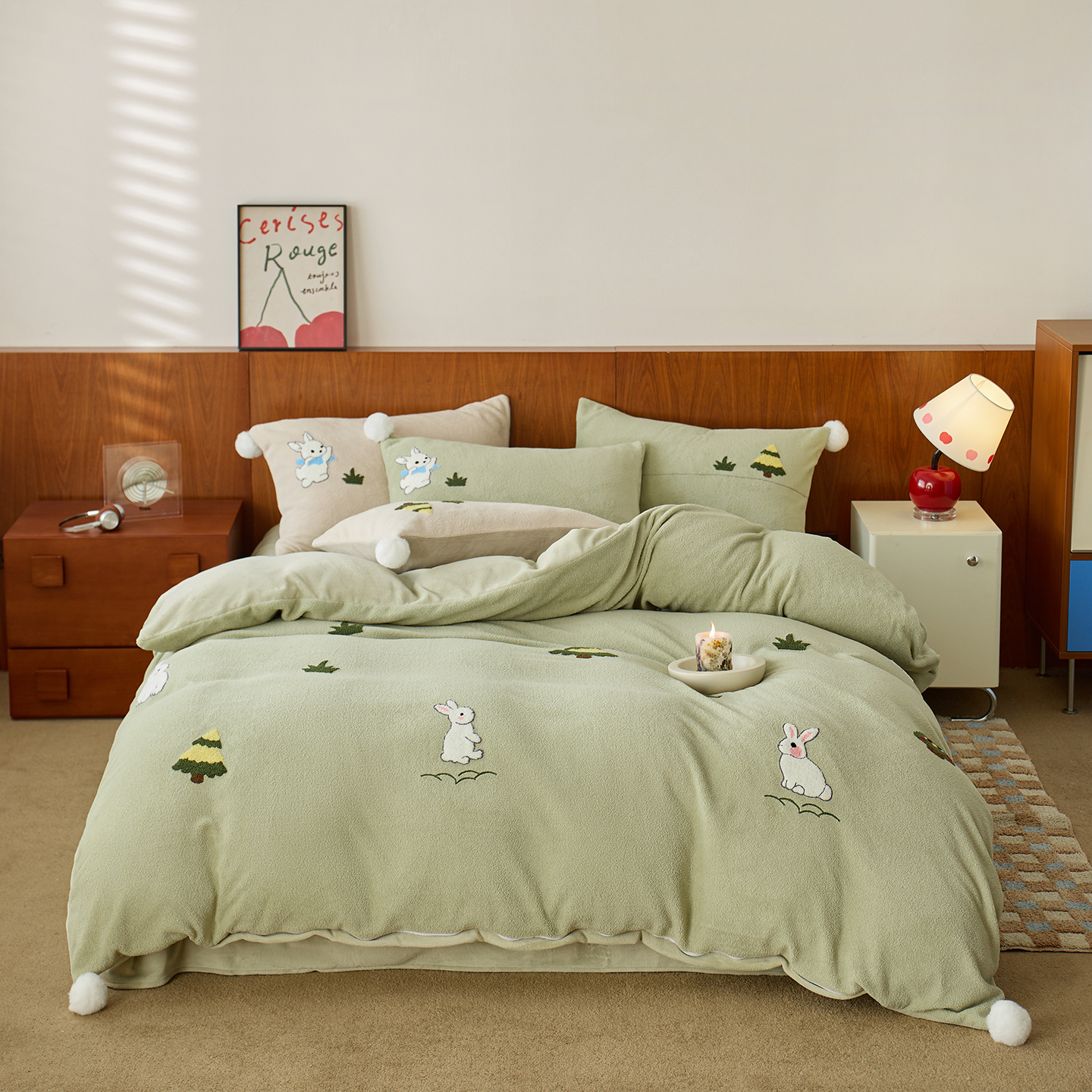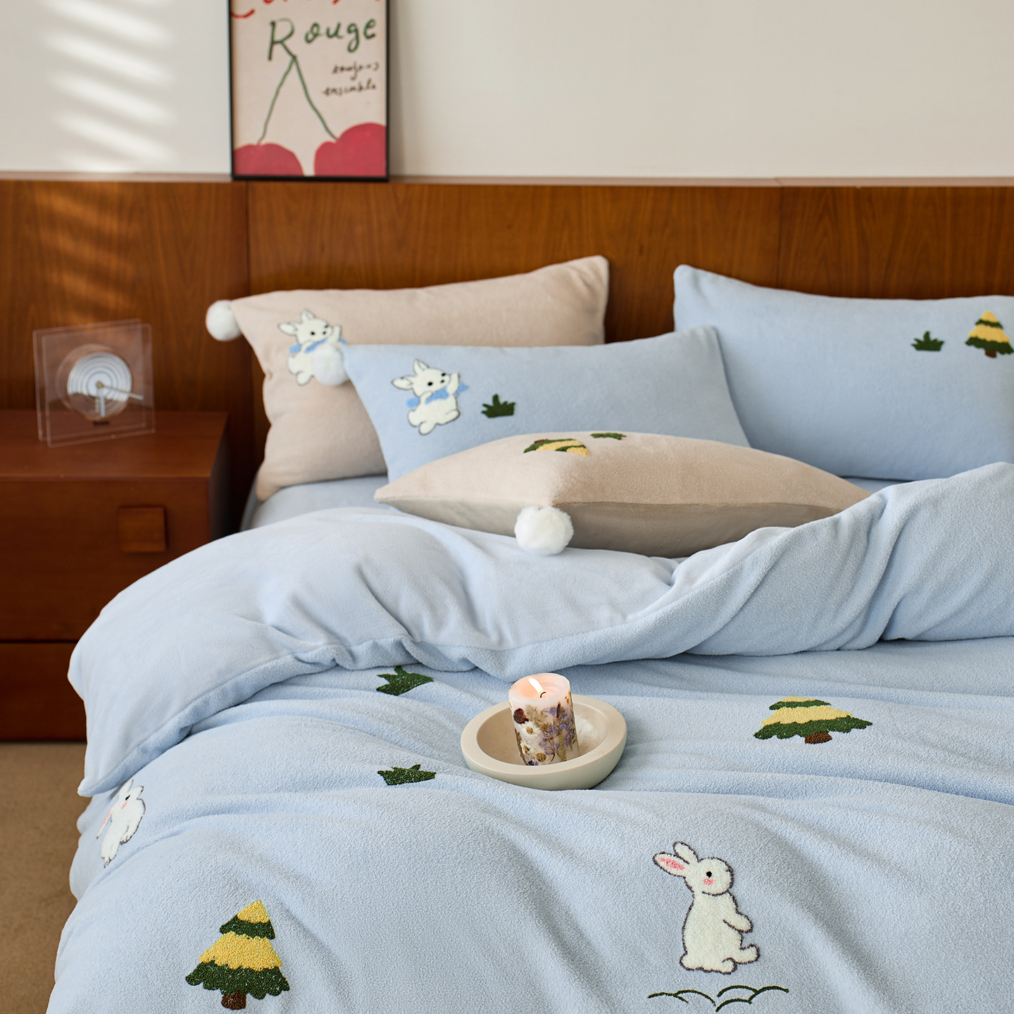 商品名称:蓝梦 2025新款全消光毛巾绣艾尼绒四件套-艾尼兔系列 浅可可