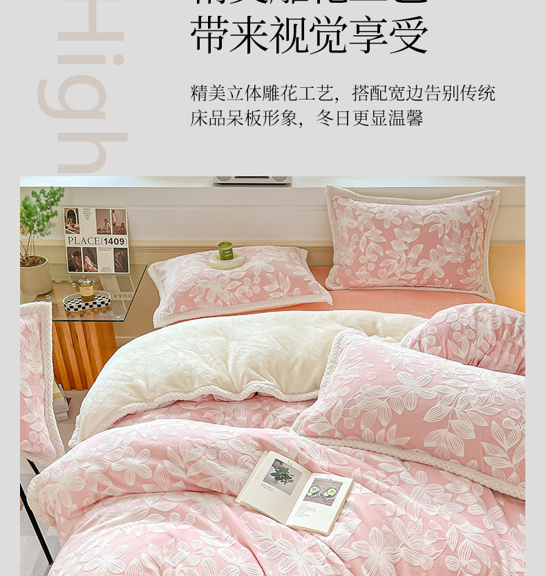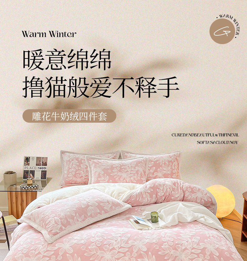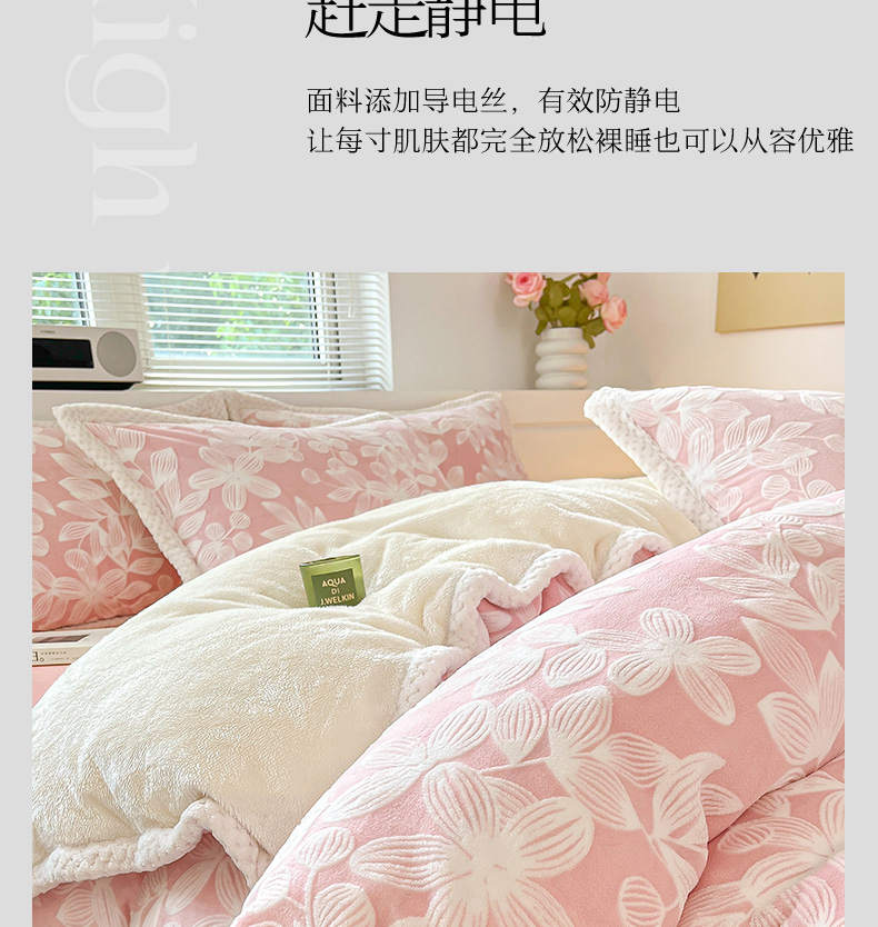 当前位置: 91家纺网 > 商品网购 > 床品套件 > 四件套 > 其它四件套 > 琪格格纺织 2025新款全消光包边立体简约清新雕花绒四件套 雕花包边-安妮花苑 粉