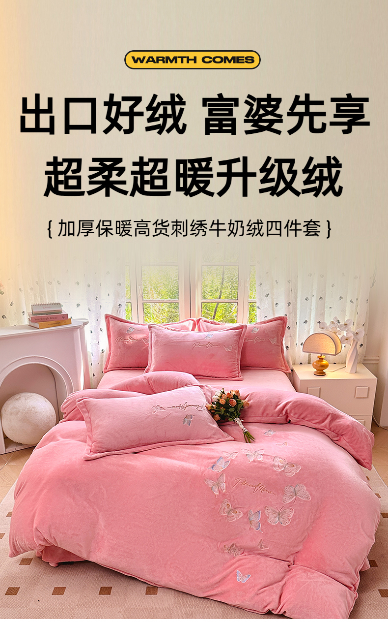 (总)【苏东来】2025高端加厚保暖外贸轻奢款纯色牛奶绒刺绣花四件套床单被套单品简约绒兔毛绒法莱绒婴儿绒套件,时光米黄,时光粉,时光卡其,时光天蓝,时光豆沙