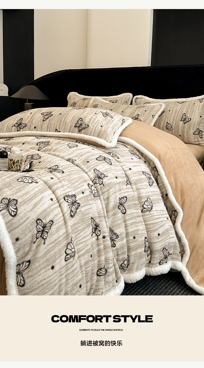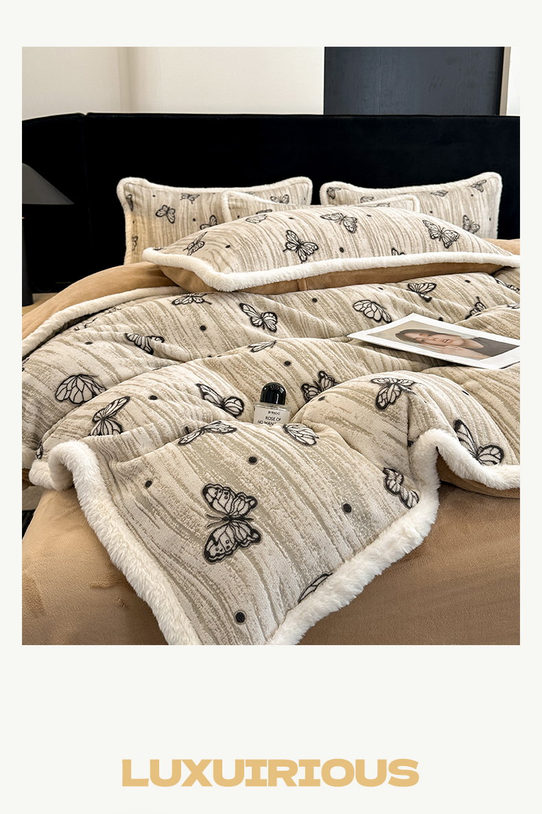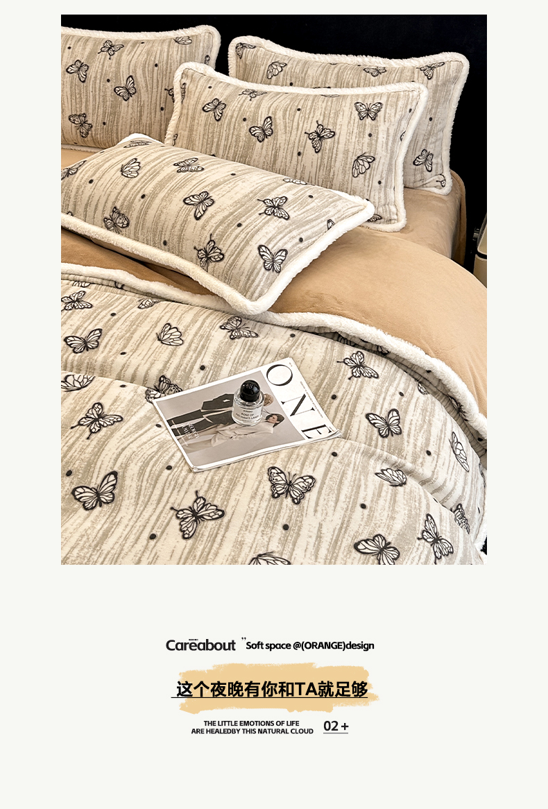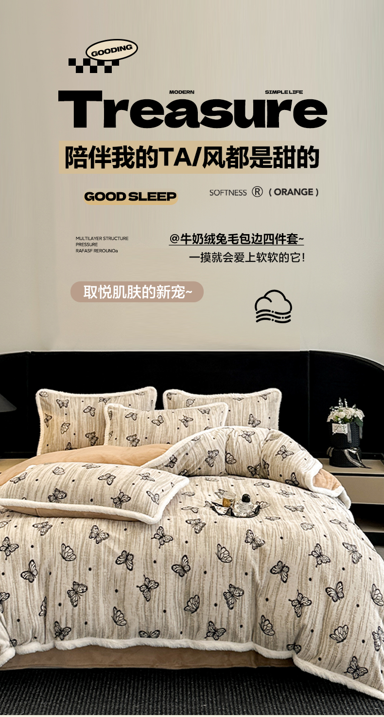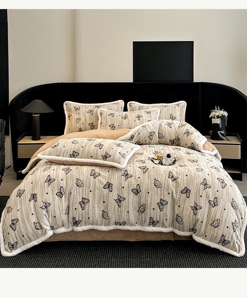商品名称:如一 2025新款立体雕花牛奶绒兔毛包边四件套 蝶舞 -咖