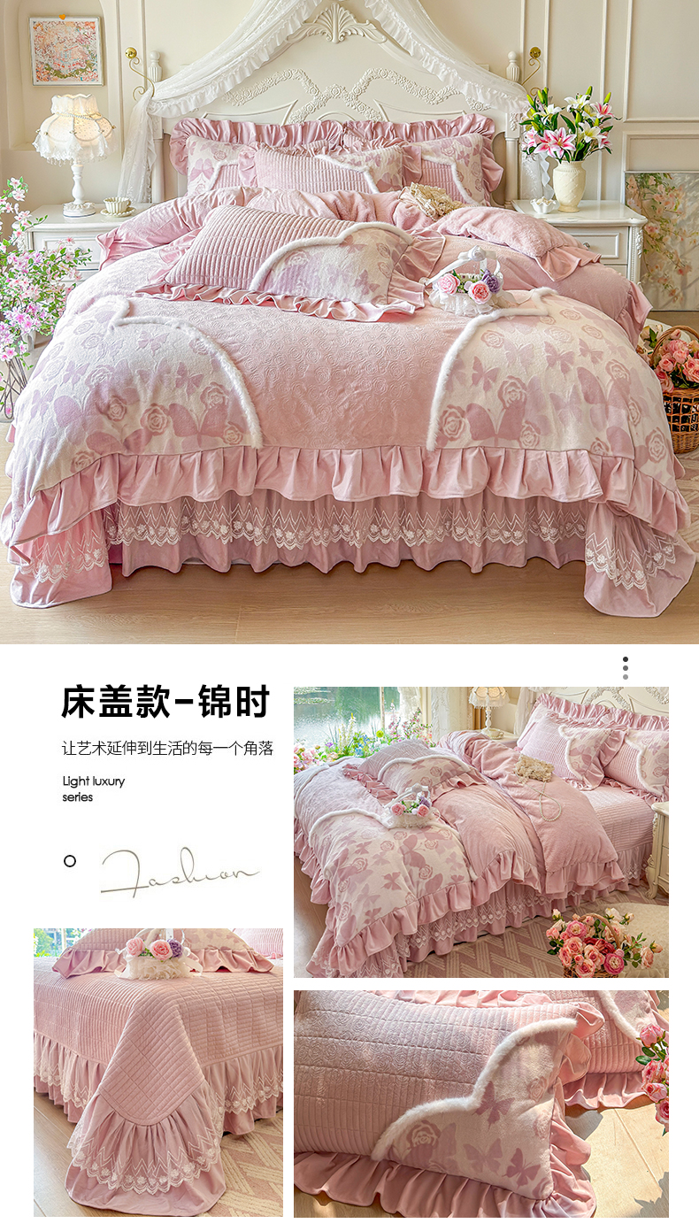 (总)宜凡家纺 2025新款兔绒提花牛奶绒夹棉床裙四件套,爱心 少女粉,爱心 粉紫,爱心 驼色,蝶舞 大红,蝶舞 米色,蝶舞 浅紫,蝶舞 玉色,简爱 苍青,简爱 豆沙紫,简爱 玉色,樱桃 苍青,樱桃 豆沙紫,樱桃 奶油白