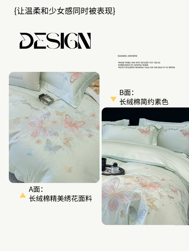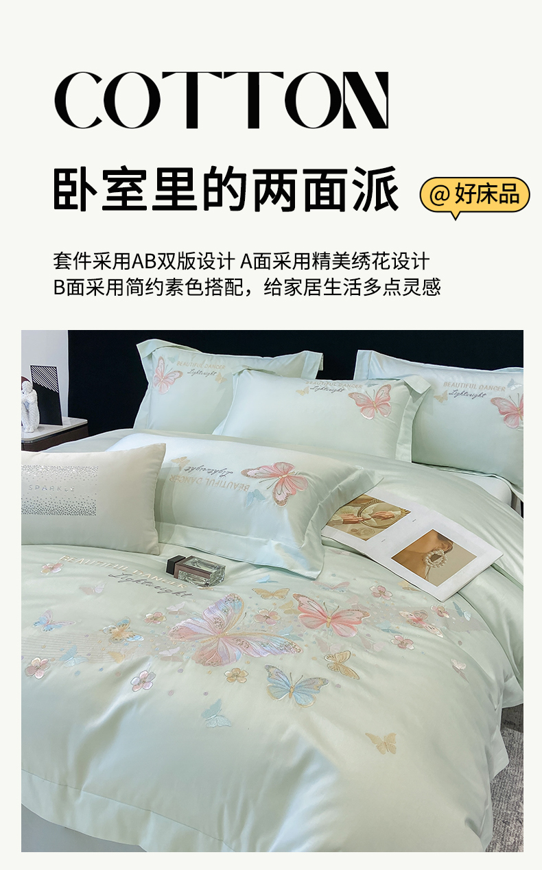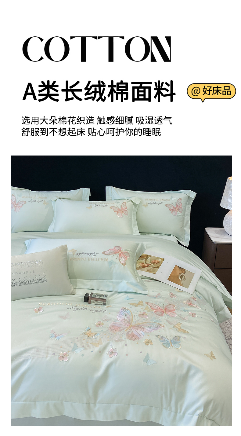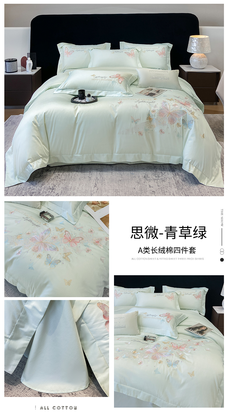 丞音家纺 2025新款母婴级A类双面全棉蝴蝶刺绣纯棉长绒棉绣花四件套床单被套 思微-青草绿