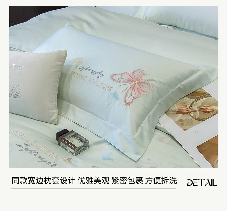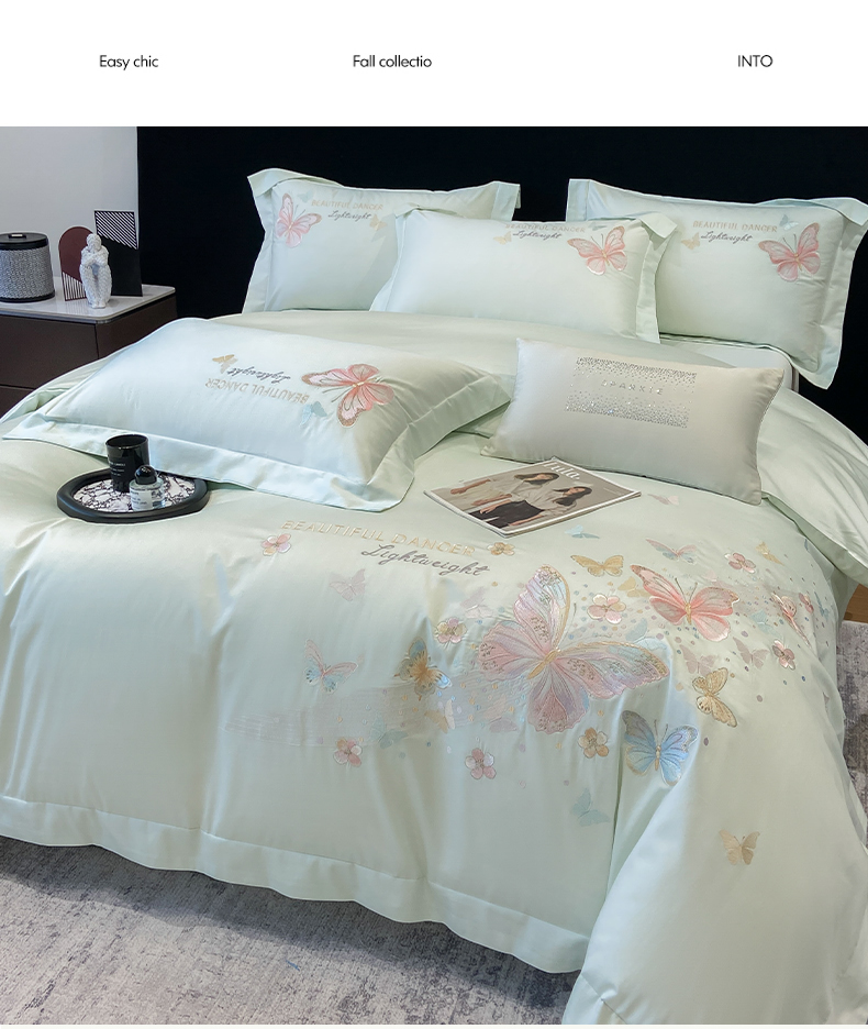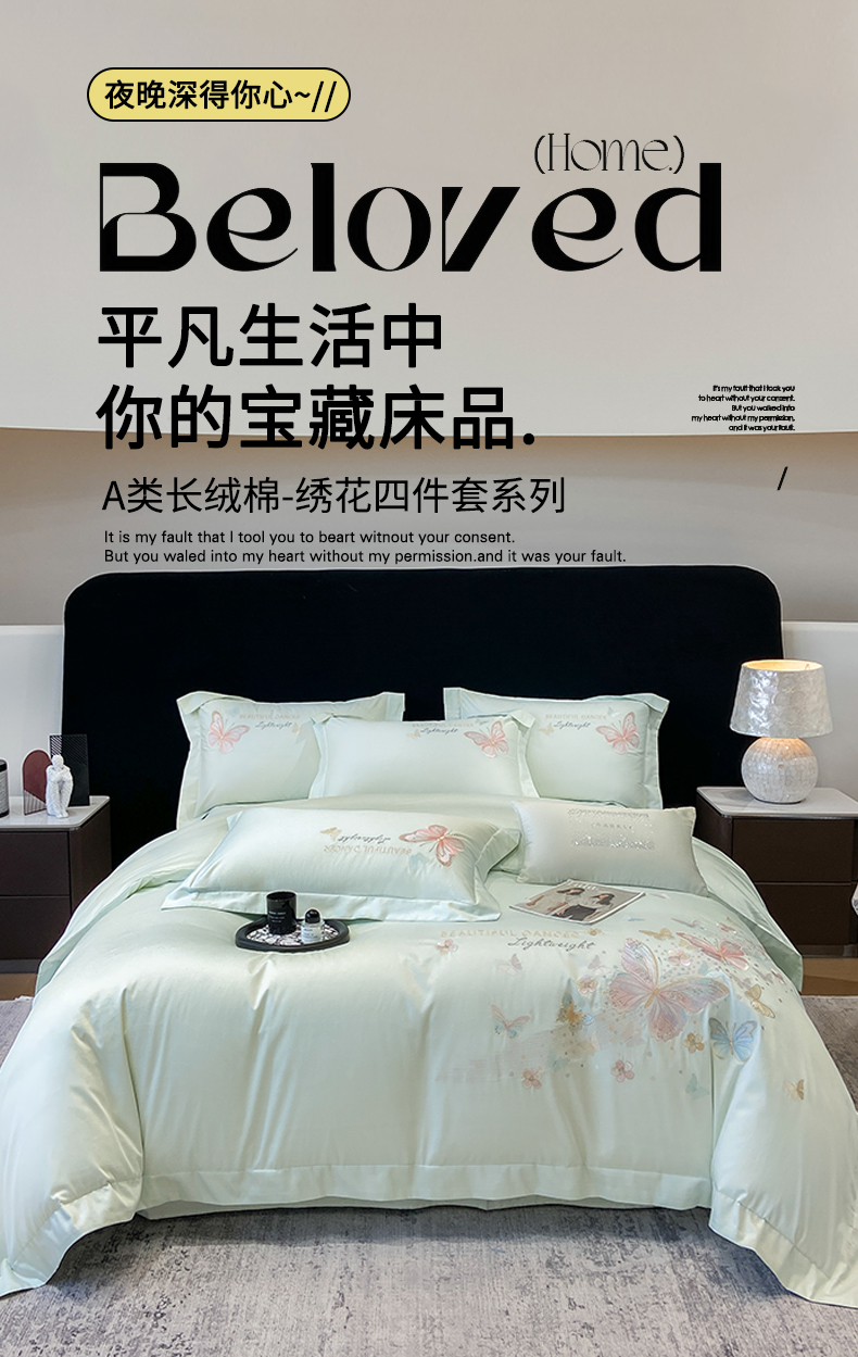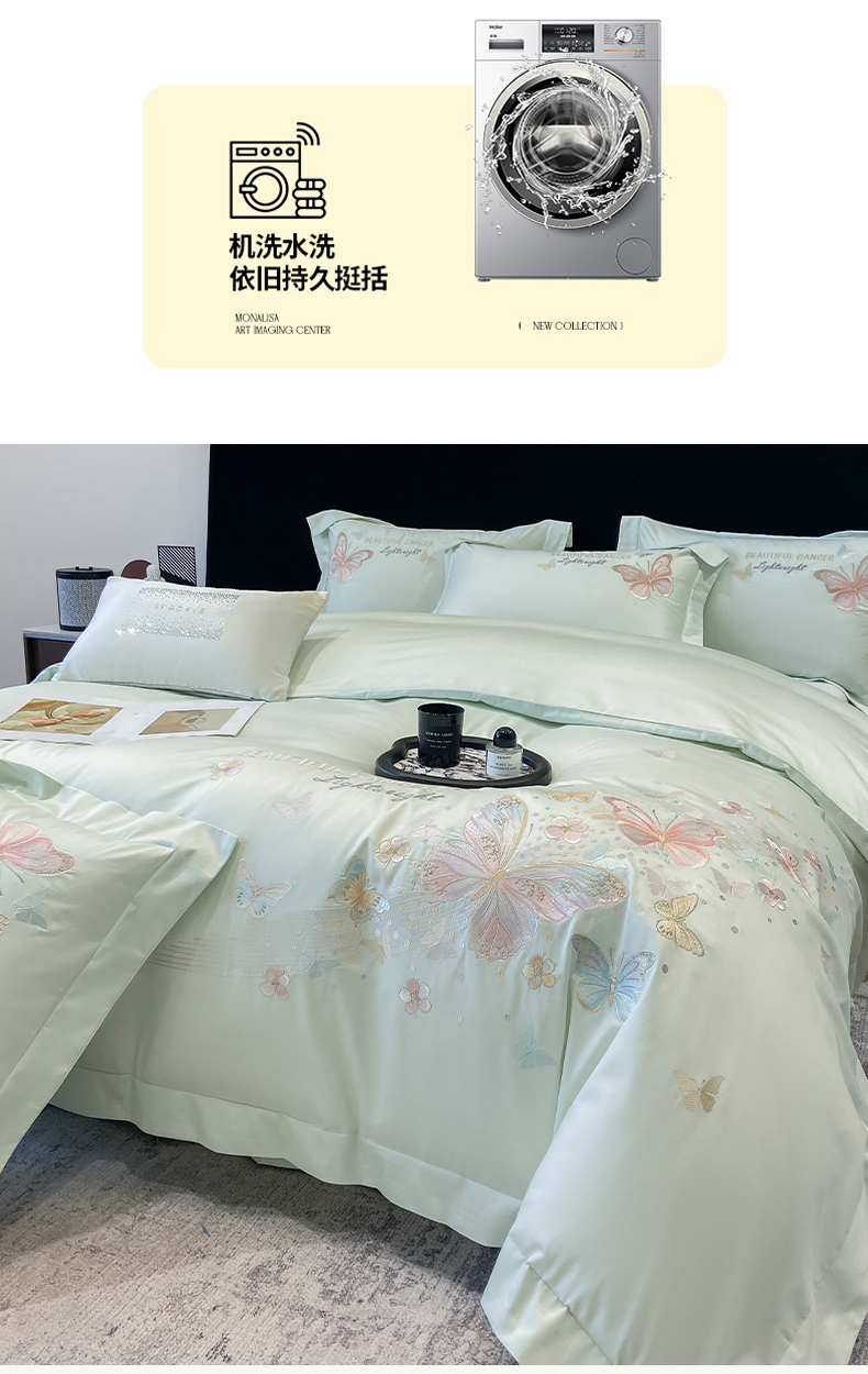 丞音家纺 2025新款母婴级A类双面全棉蝴蝶刺绣纯棉长绒棉绣花四件套床单被套 思微-青草绿