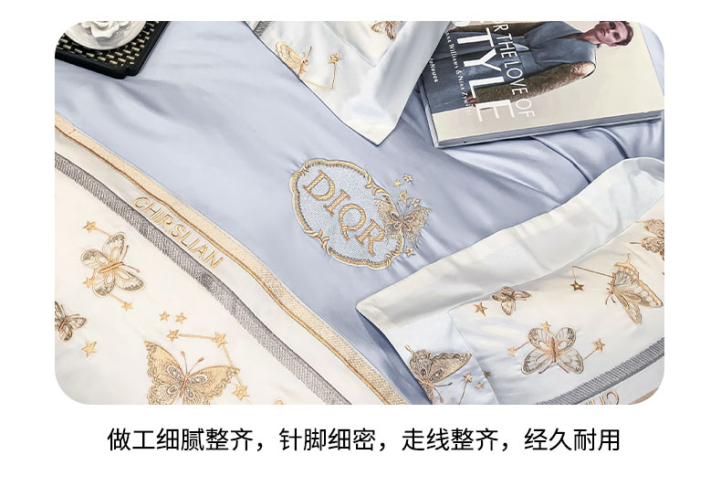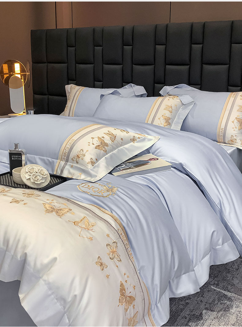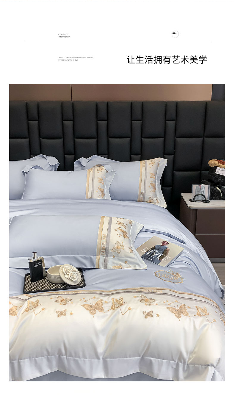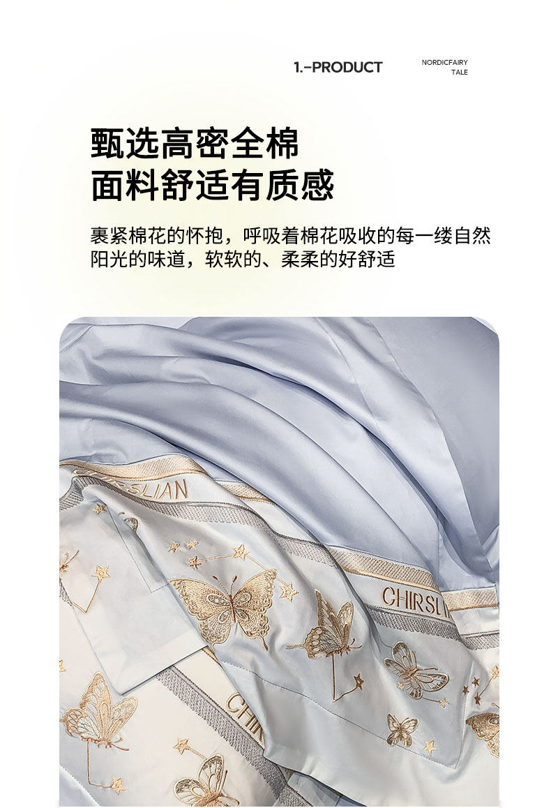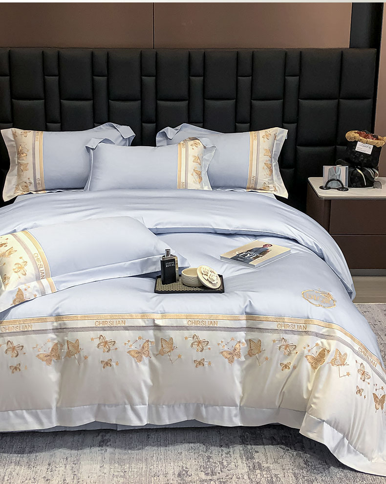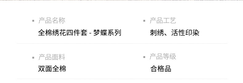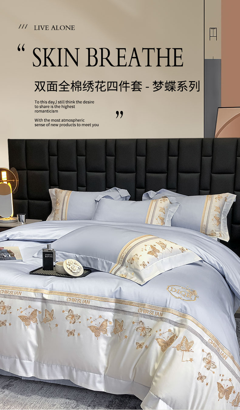 商品名称:丞音家纺 2025新款高档包装A类母婴级双面全棉蝴蝶刺绣纯棉长绒棉绣花四件套 梦蝶-雾霾蓝