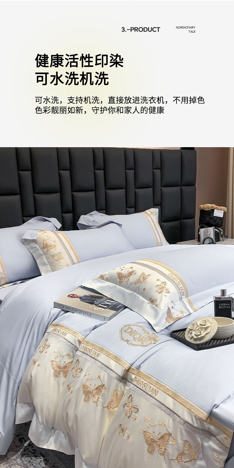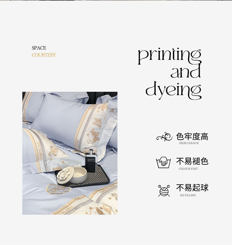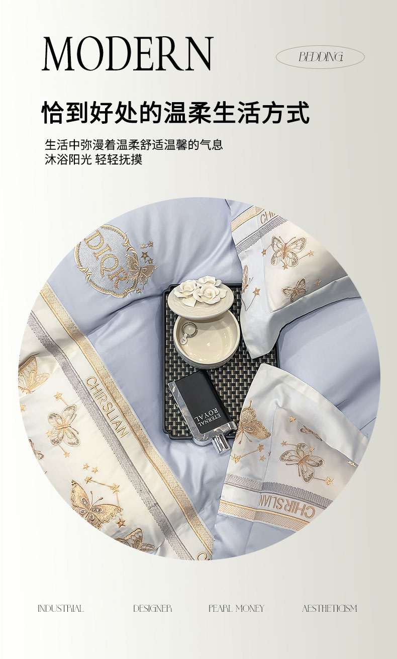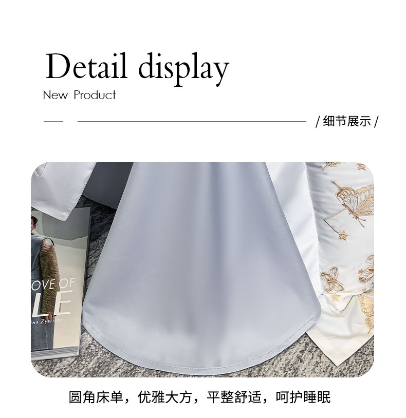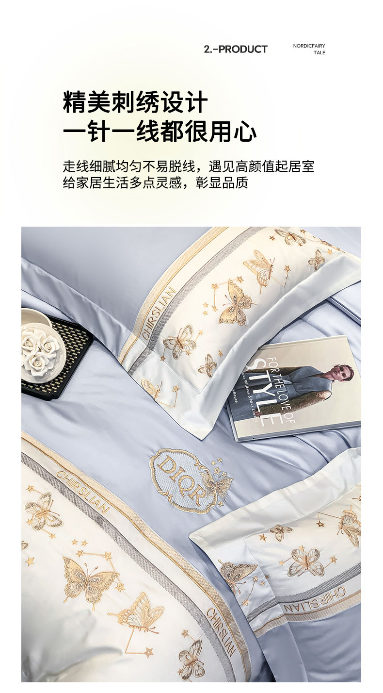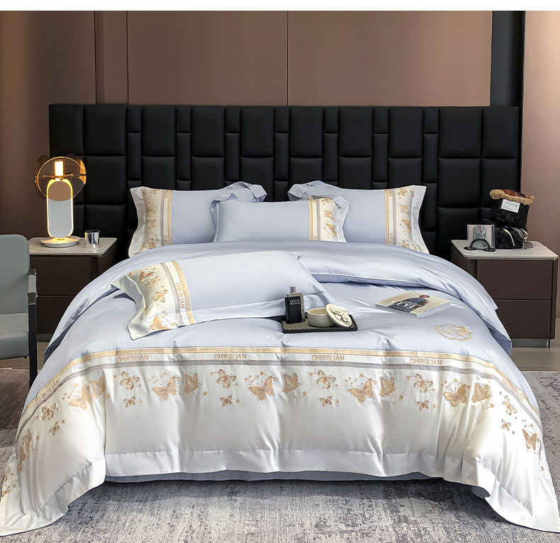 商品名称:丞音家纺 2025新款高档包装A类母婴级双面全棉蝴蝶刺绣纯棉长绒棉绣花四件套 梦蝶-雾霾蓝