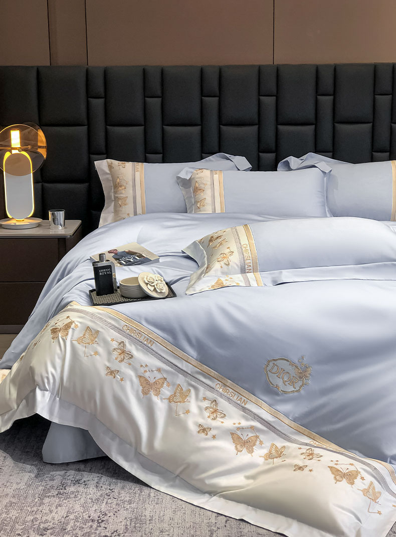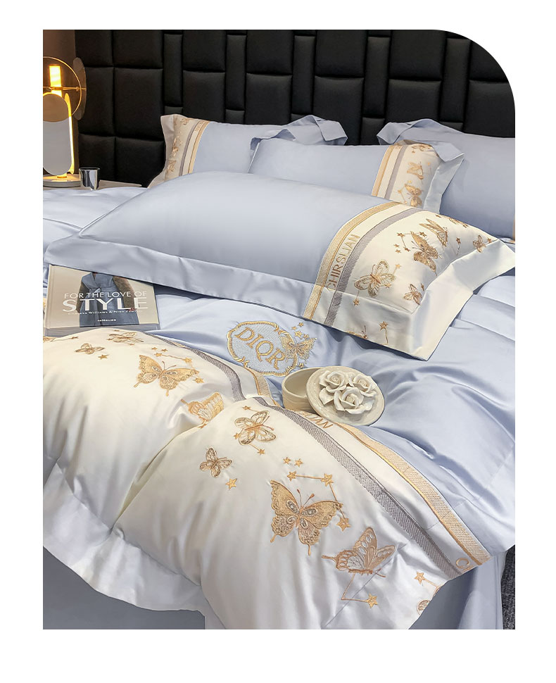 丞音家纺 2025新款高档包装A类母婴级双面全棉蝴蝶刺绣纯棉长绒棉绣花四件套 梦蝶-雾霾蓝