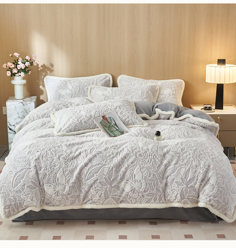 商品名称:金鹰 2025新款A类兔毛绒烂花四件套牛奶绒四件套加厚保暖绒套件 蝶恋-灰色