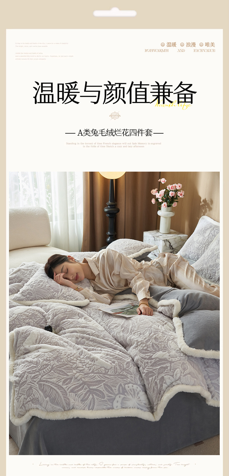 (总)金鹰 2025新款A类兔毛绒烂花四件套牛奶绒四件套加厚保暖绒套件,普罗旺斯,蝶恋-灰色,蝶恋-粉色,花开富贵,恋语蓝,蔓生
