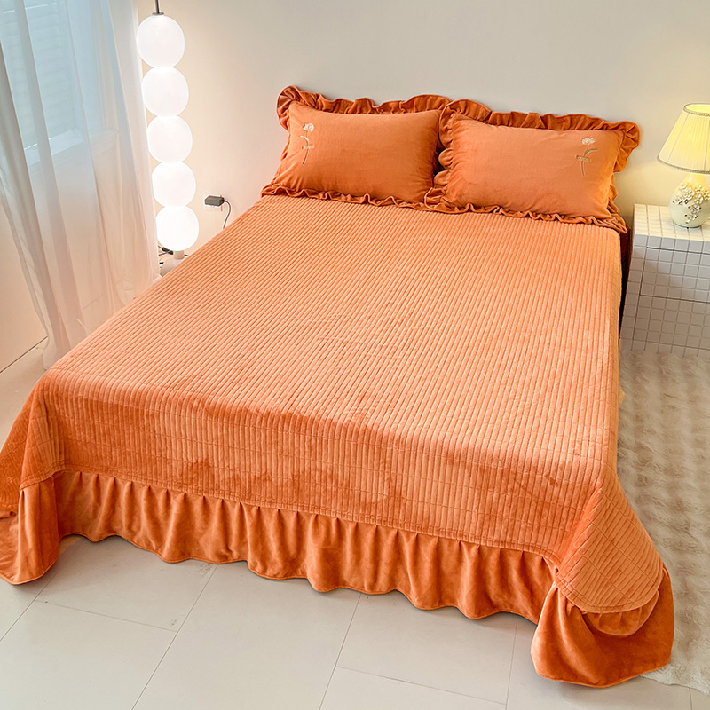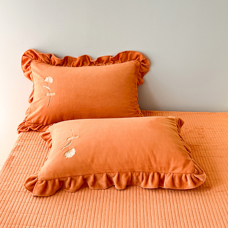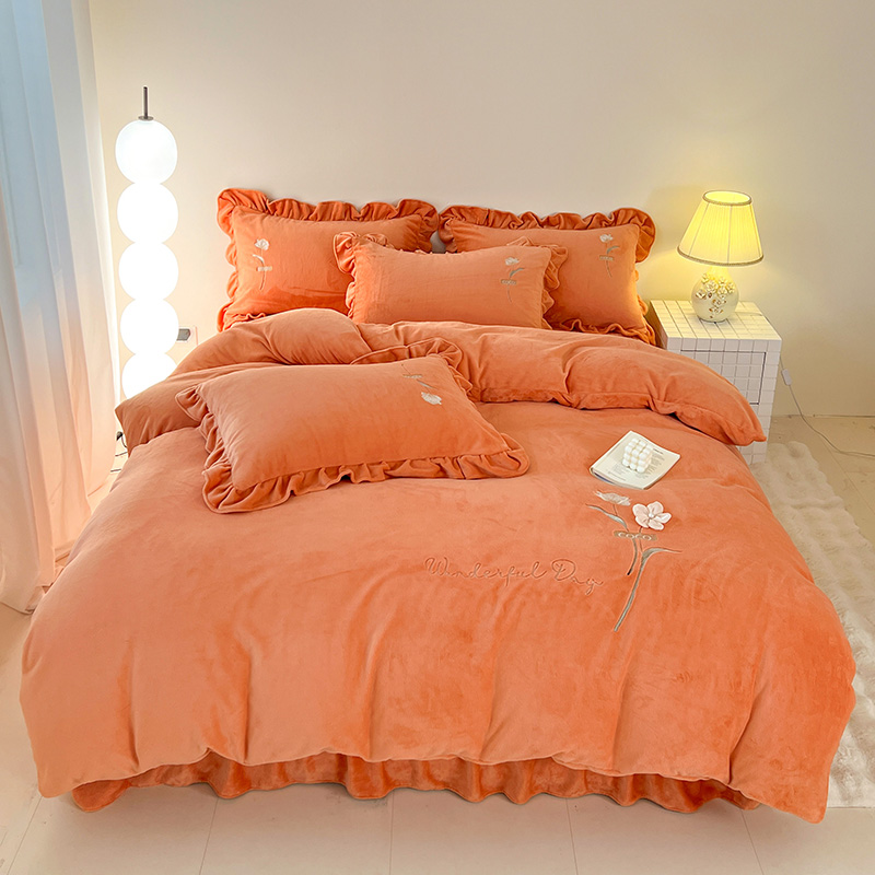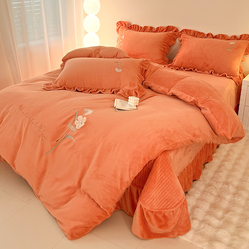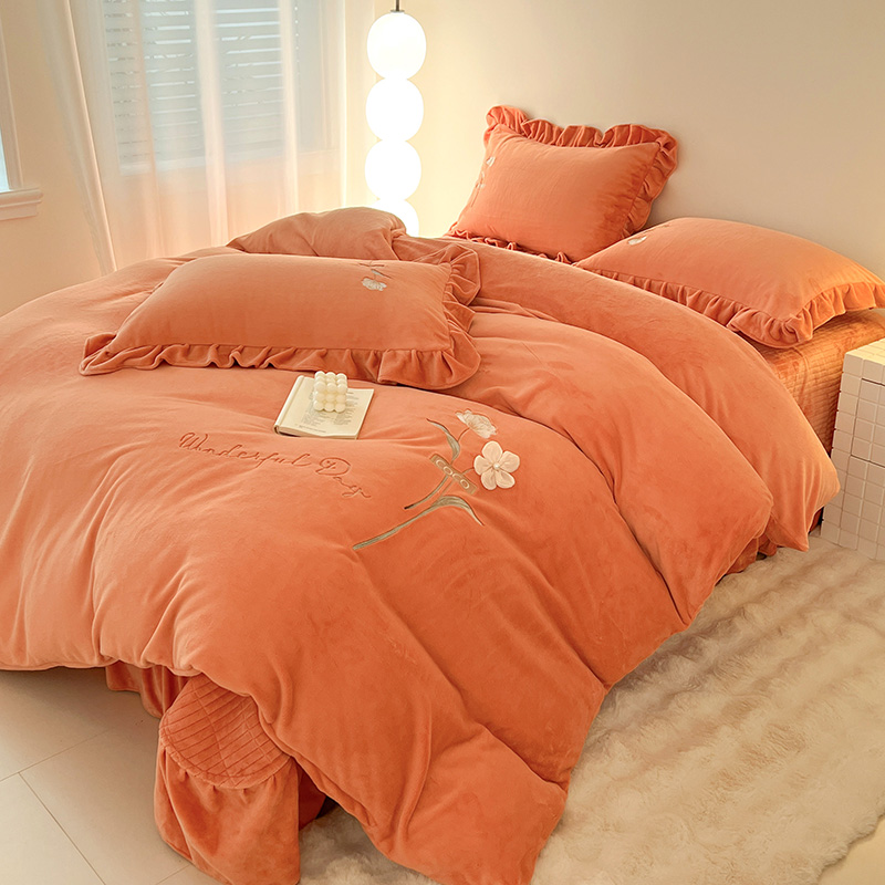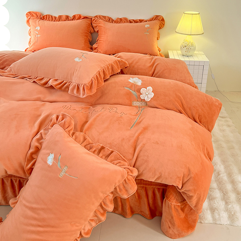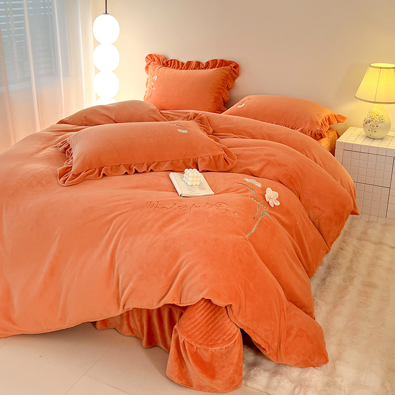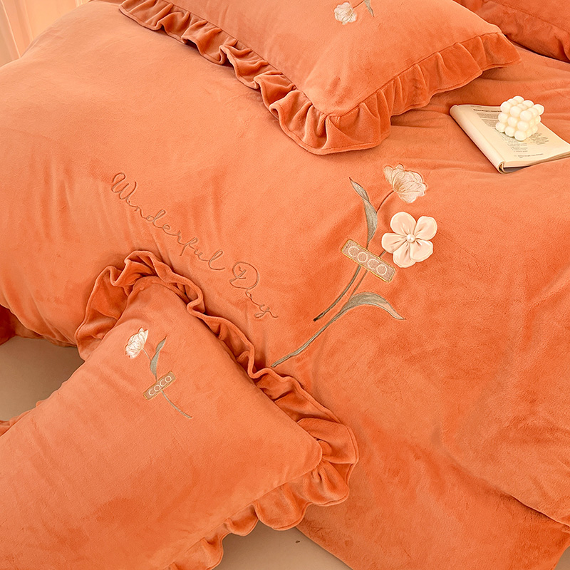 商品名称:梦莱斯 2025新款全消光床盖款牛奶绒刺绣四件套-山茶花 山茶花-橙