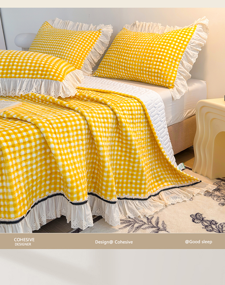 2025高克重加厚牛奶绒无印风格子床盖蕾丝花边织带花边宝宝绒婴儿绒简约风单床盖床褥全棉花边床单三件套