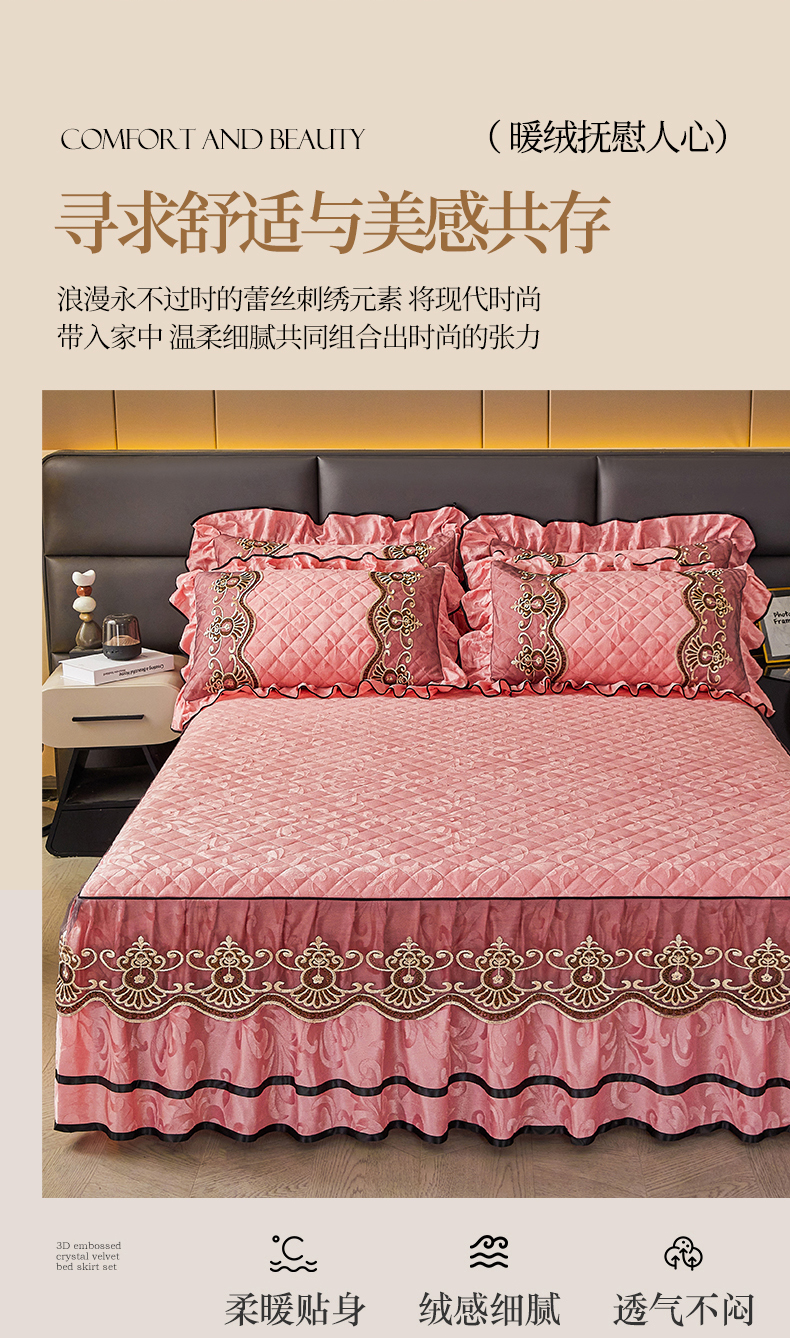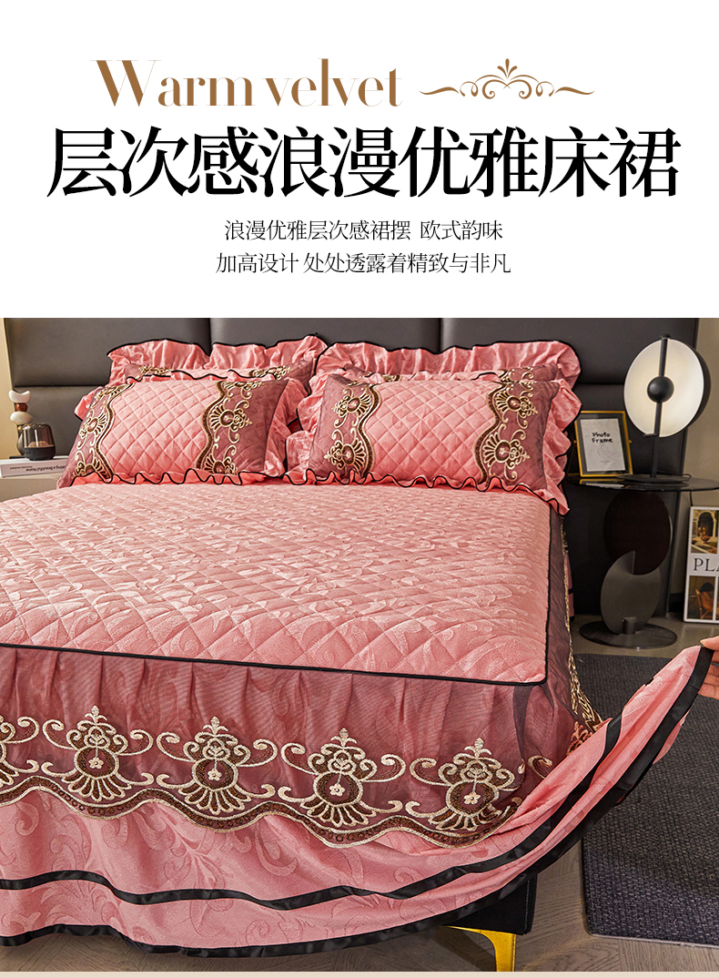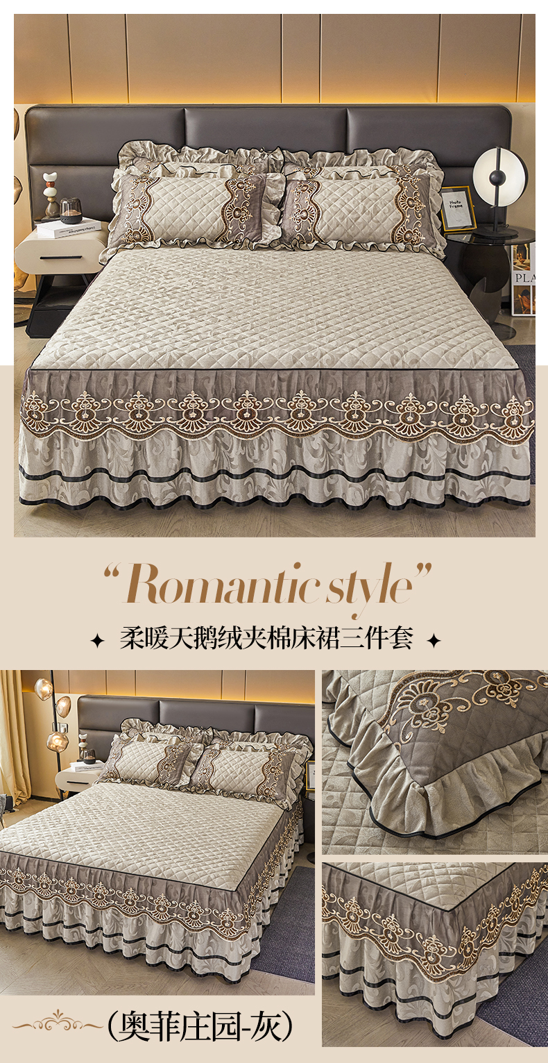 • 91家纺网 家纺一手货源 找家纺 好儿喜家纺 2025新款柔暖天鹅绒夹棉床裙奥菲庄园系列床裙三件套 奥菲庄园-驼