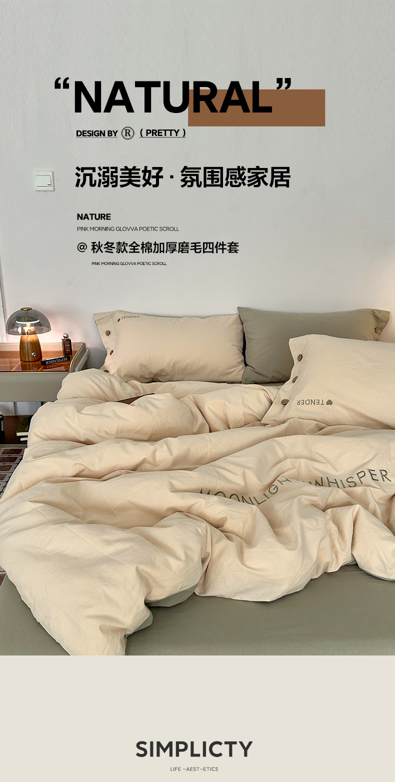 当前位置: 91家纺网 > 商品网购 > 床品套件 > 四件套 > 全棉普通四件套 > 艾咪-Amy ntmy 2025秋冬纽扣款全棉加厚磨毛刺绣四件套-漫月 漫月咖米