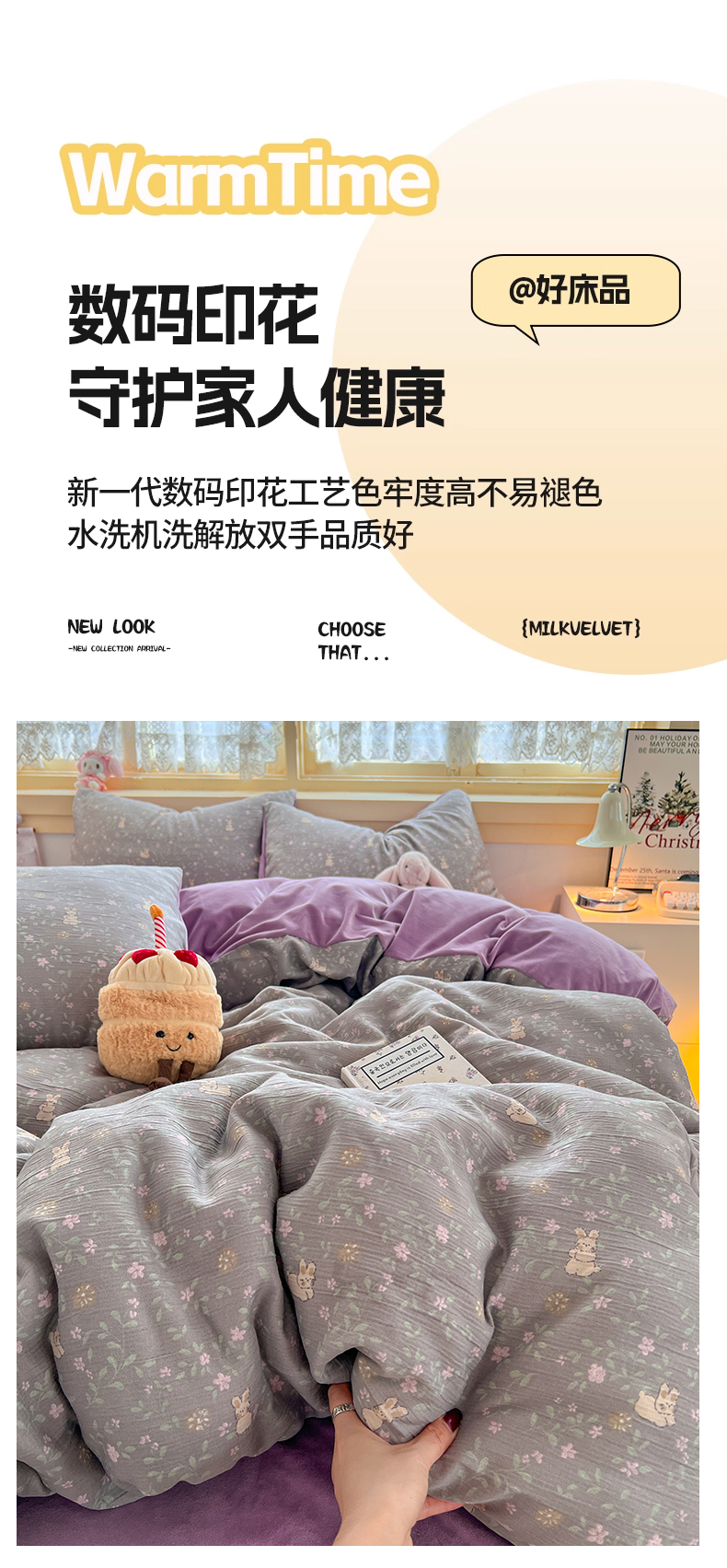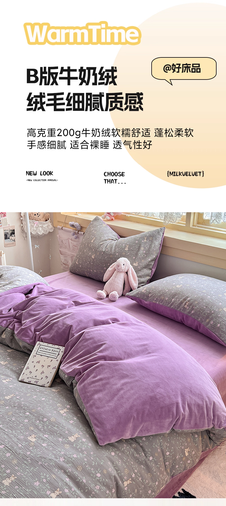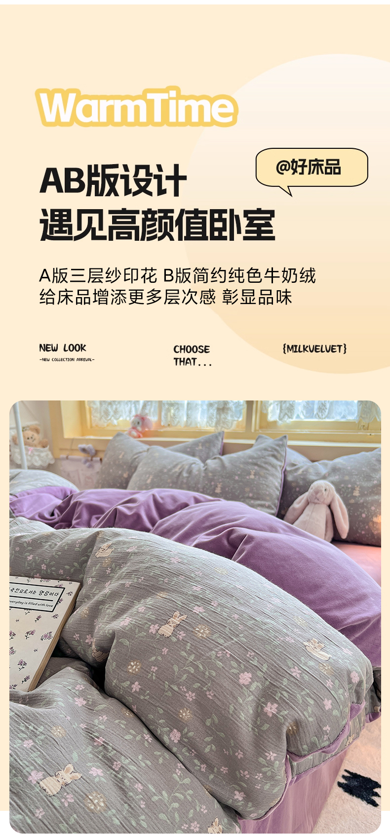 商品名称:瑞钰 2025新款A版三层纱B版牛奶绒四件套系列 花间兔