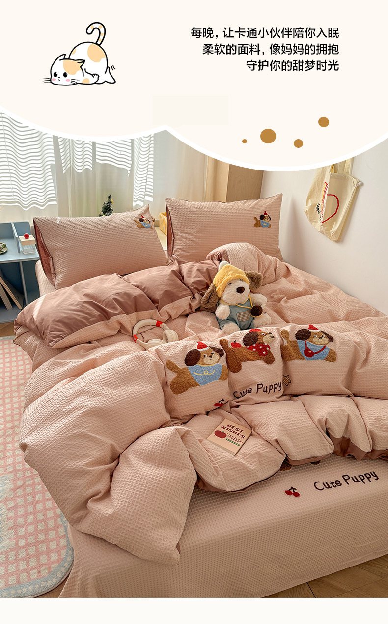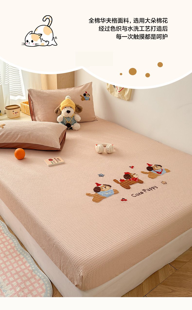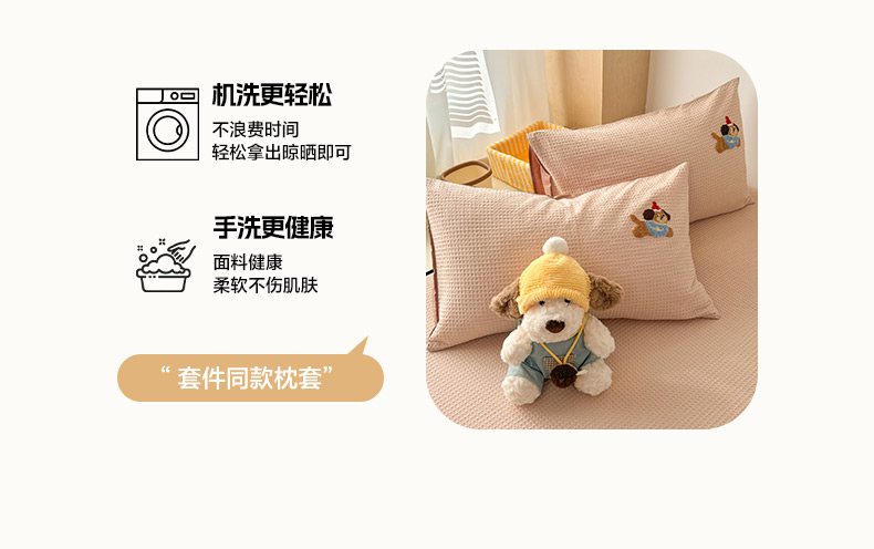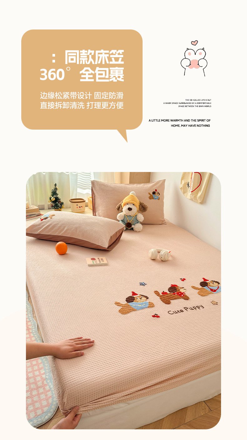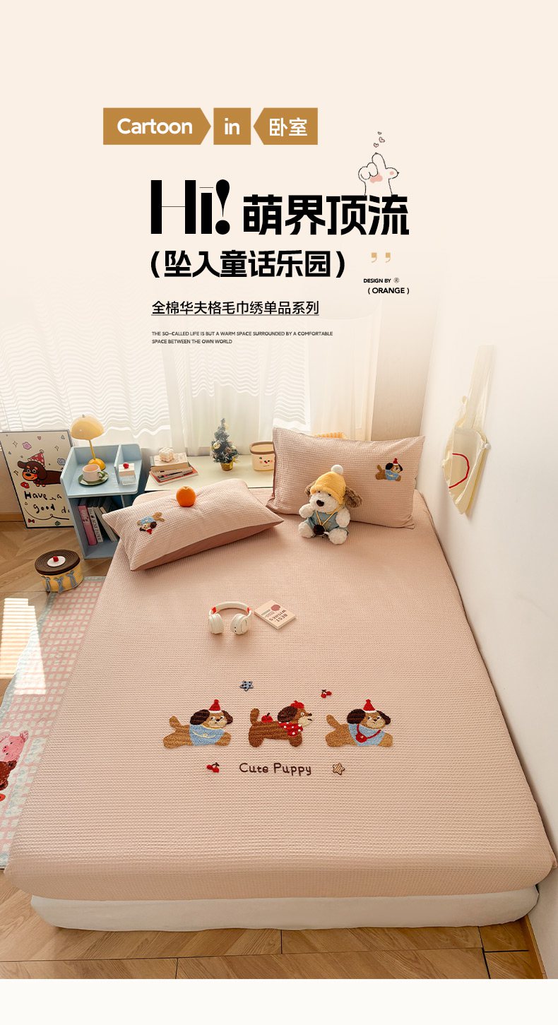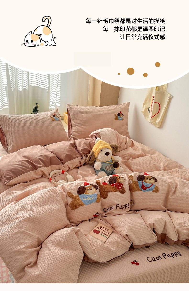 当前位置: 91家纺网 > 商品网购 > 床品套件 > 四件套 > 全棉普通四件套 > 雅居纺家纺 2026新款全棉华夫格毛巾绣单品系列 米驼腊肠狗
