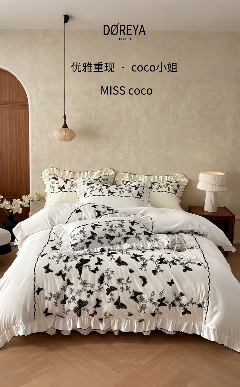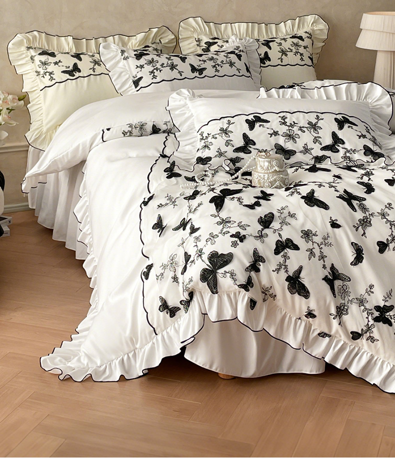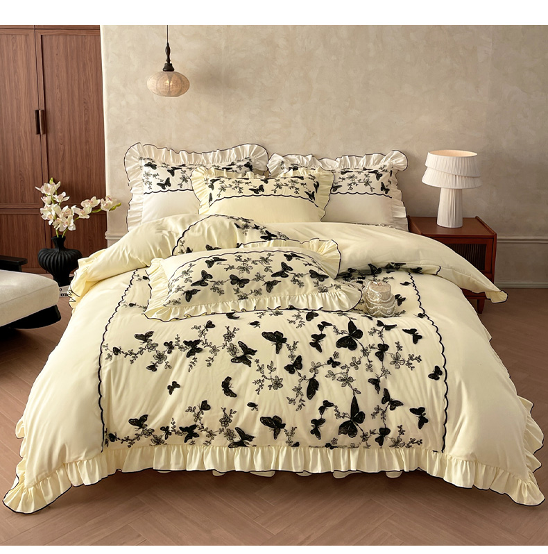 当前位置: 91家纺网 > 商品网购 > 床品套件 > 四件套 > 其它四件套 > 乐卧家居 2026新款130克磨毛法式宫廷感浪漫精致刺绣丝黑蝴蝶荷边四件套-蝶梦 蝶梦-粉色
