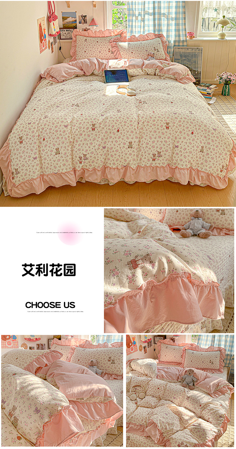 当前位置: 91家纺网 > 商品网购 > 床品套件 > 四件套 > 其它四件套 > 富米莱(原臻工厂) 2026春夏新款仿棉A类韩系大花边床盖床裙四件套 艾利花园