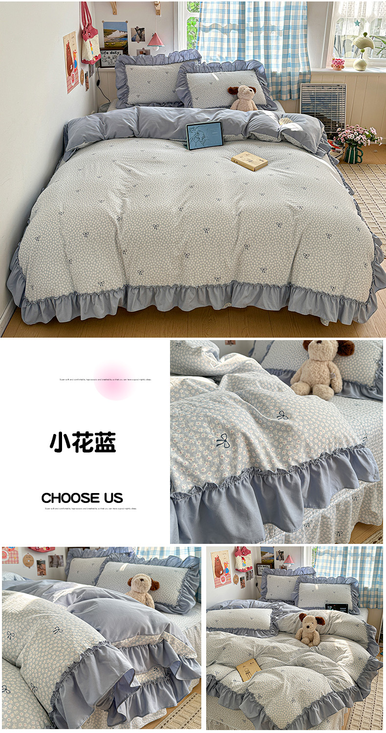 当前位置: 91家纺网 > 商品网购 > 床品套件 > 四件套 > 其它四件套 > 富米莱(原臻工厂) 2026春夏新款仿棉A类韩系大花边床盖床裙四件套 小花蓝