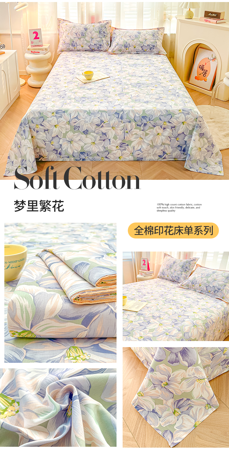 (总)珂博家纺 2025新款12868全棉纯棉小清新印花系列单床单床笠-系列二,繁花似锦,粉萼摇青,粉穹星语,浮青曳紫,结系花铃,汪星织梦,樱露垂角