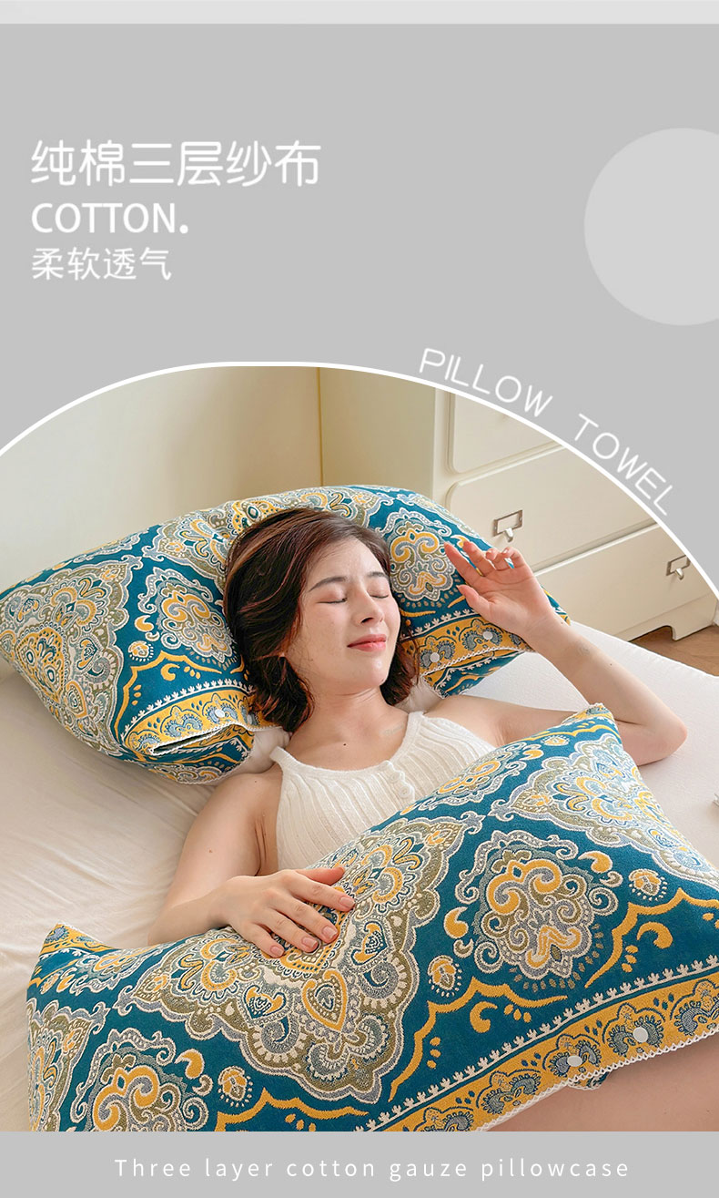 朴尔家纺-毛巾被 2026新款半包可调节暗扣魔术全棉纯棉三层纱布枕巾 玛雅岩纹-蓝白 53x110cm枕巾一对