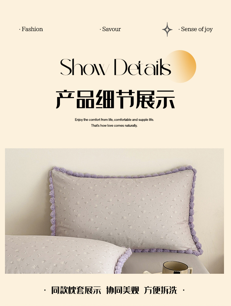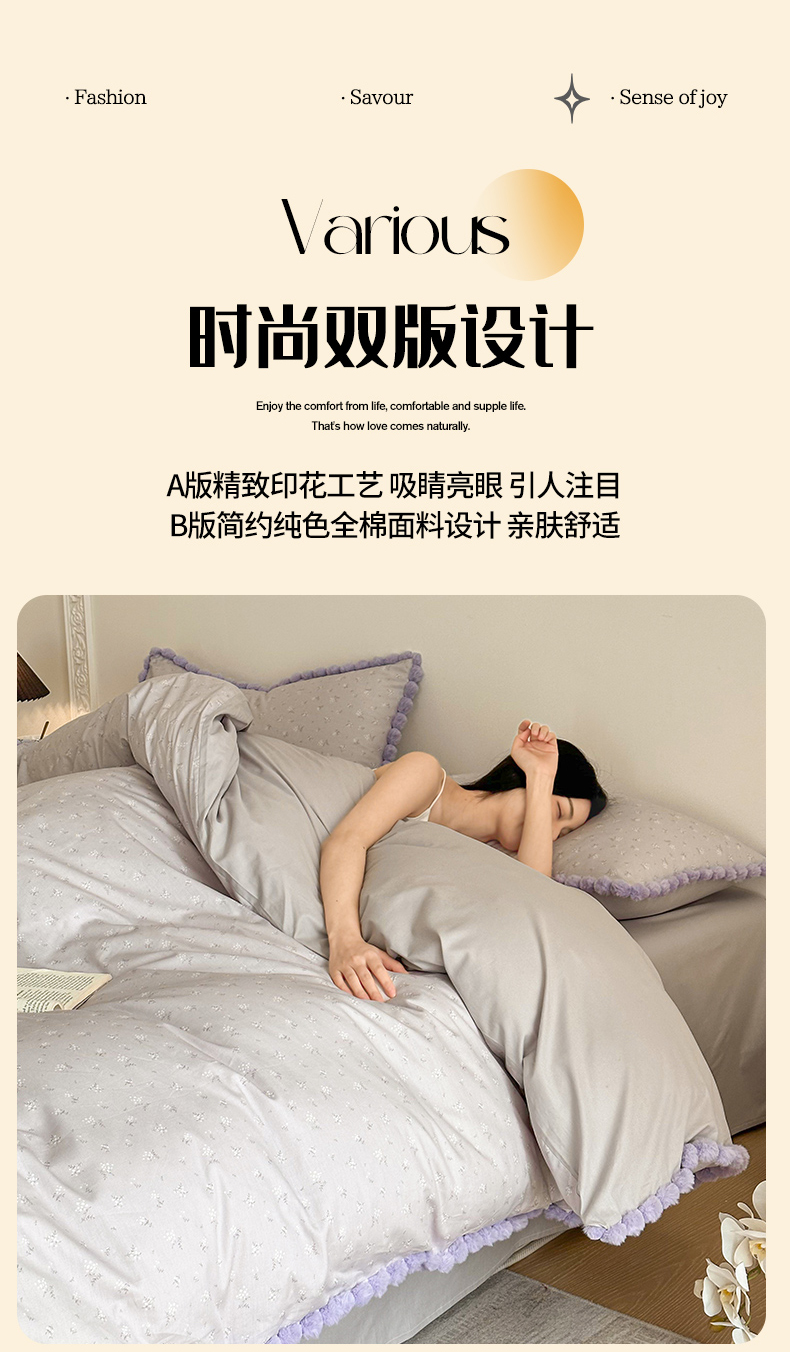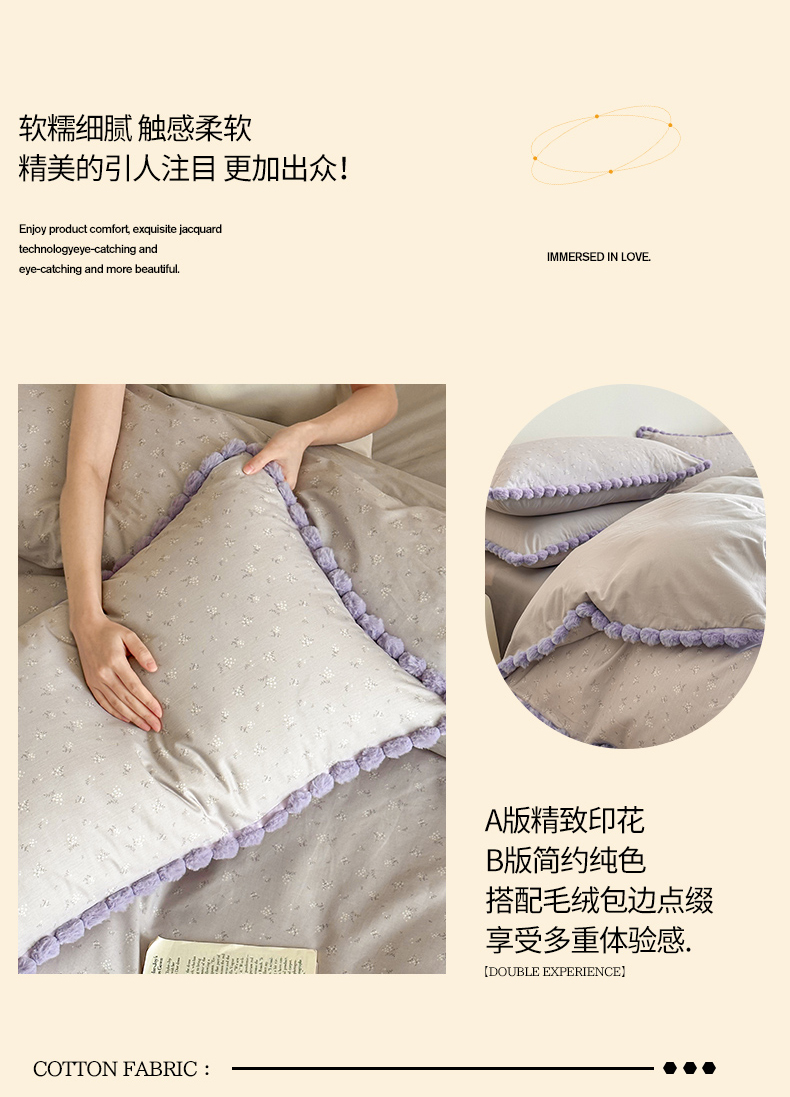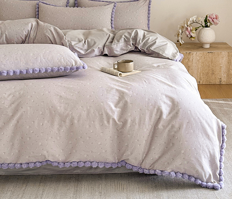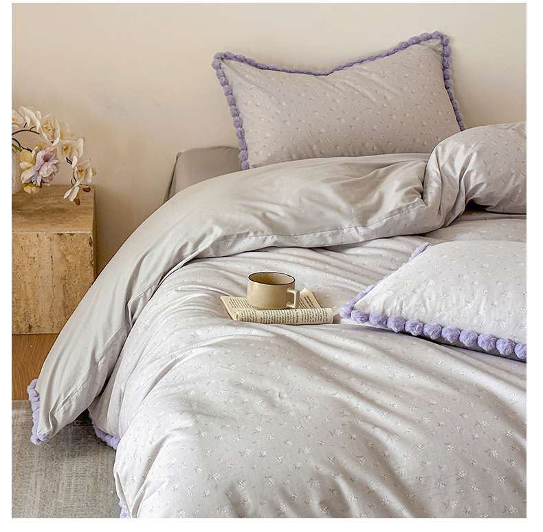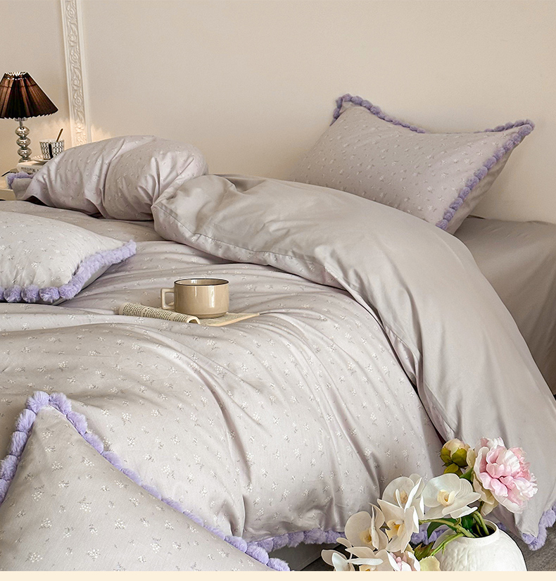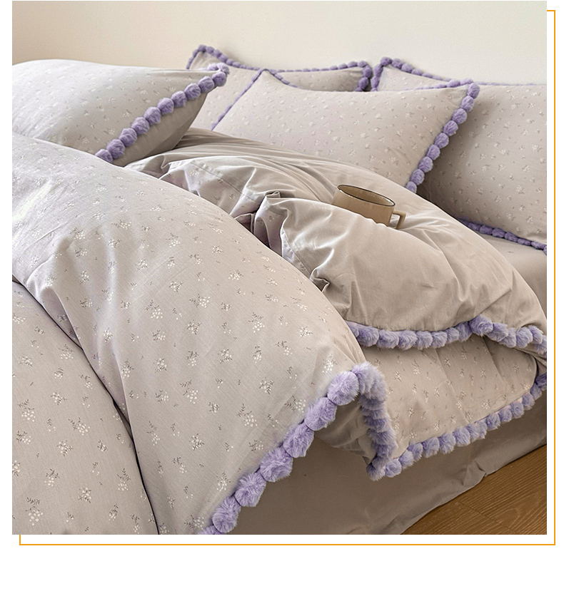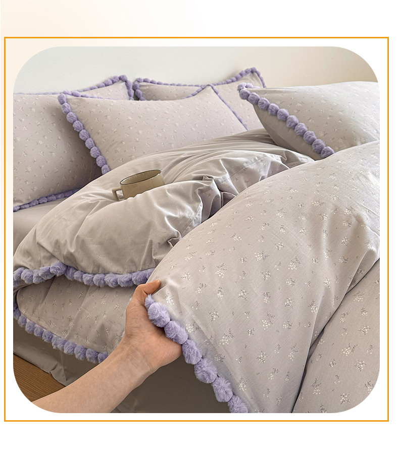 商品名称:羚羊语家纺 2026新款全棉毛球款四件套40支纯棉轻奢13372小清新喷气印花四件套被套床单床笠三件套 暮山紫