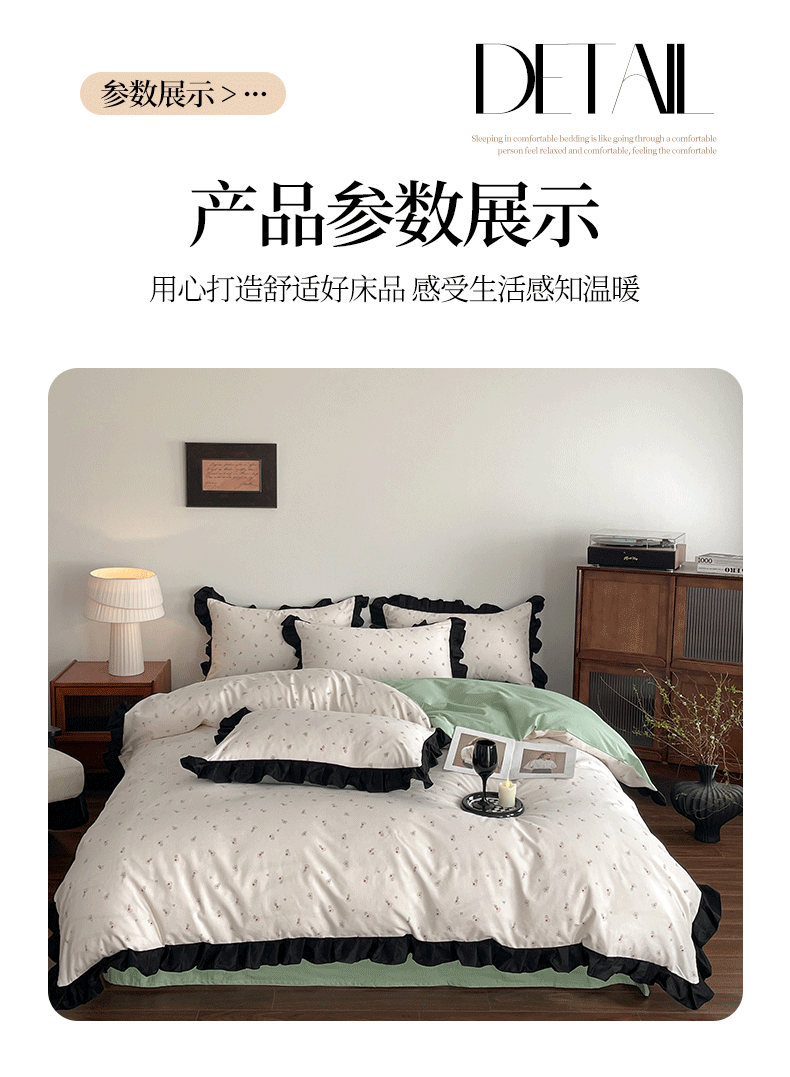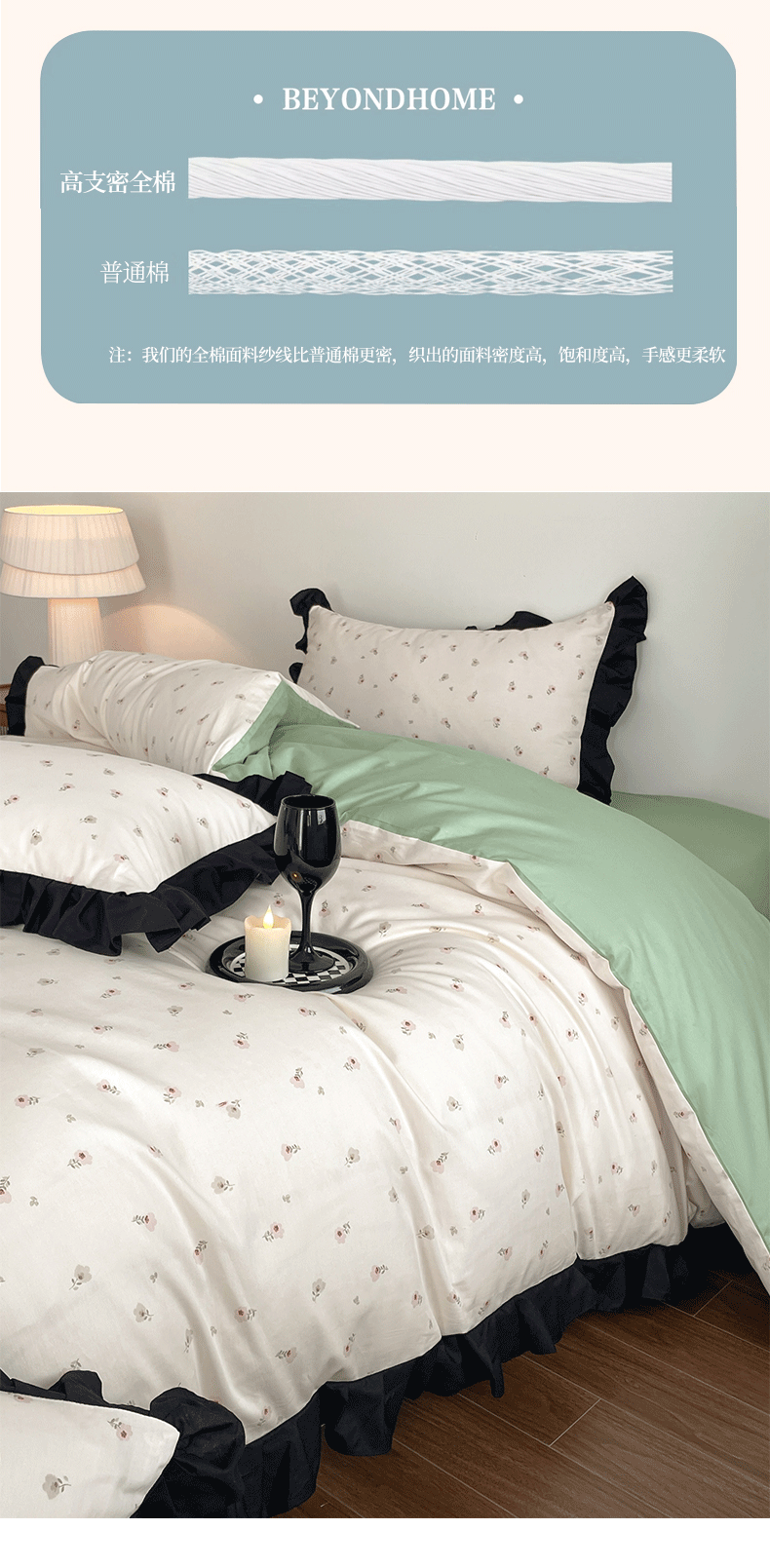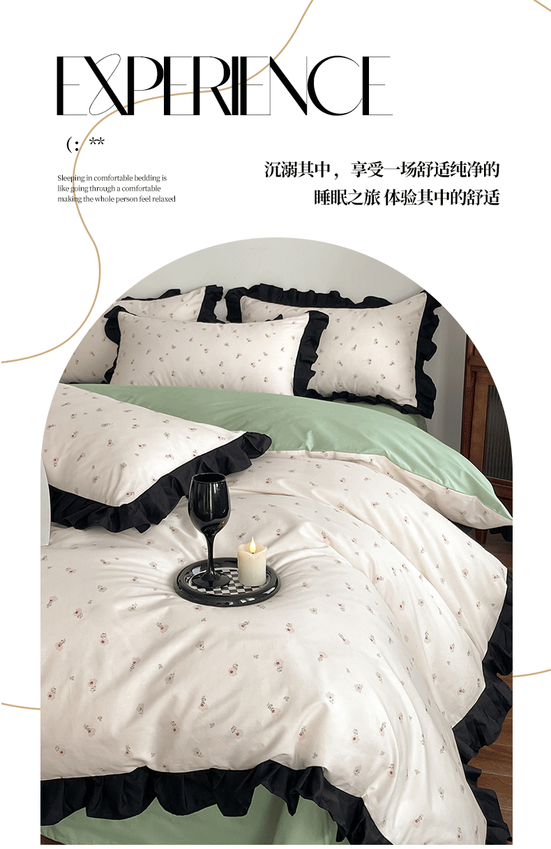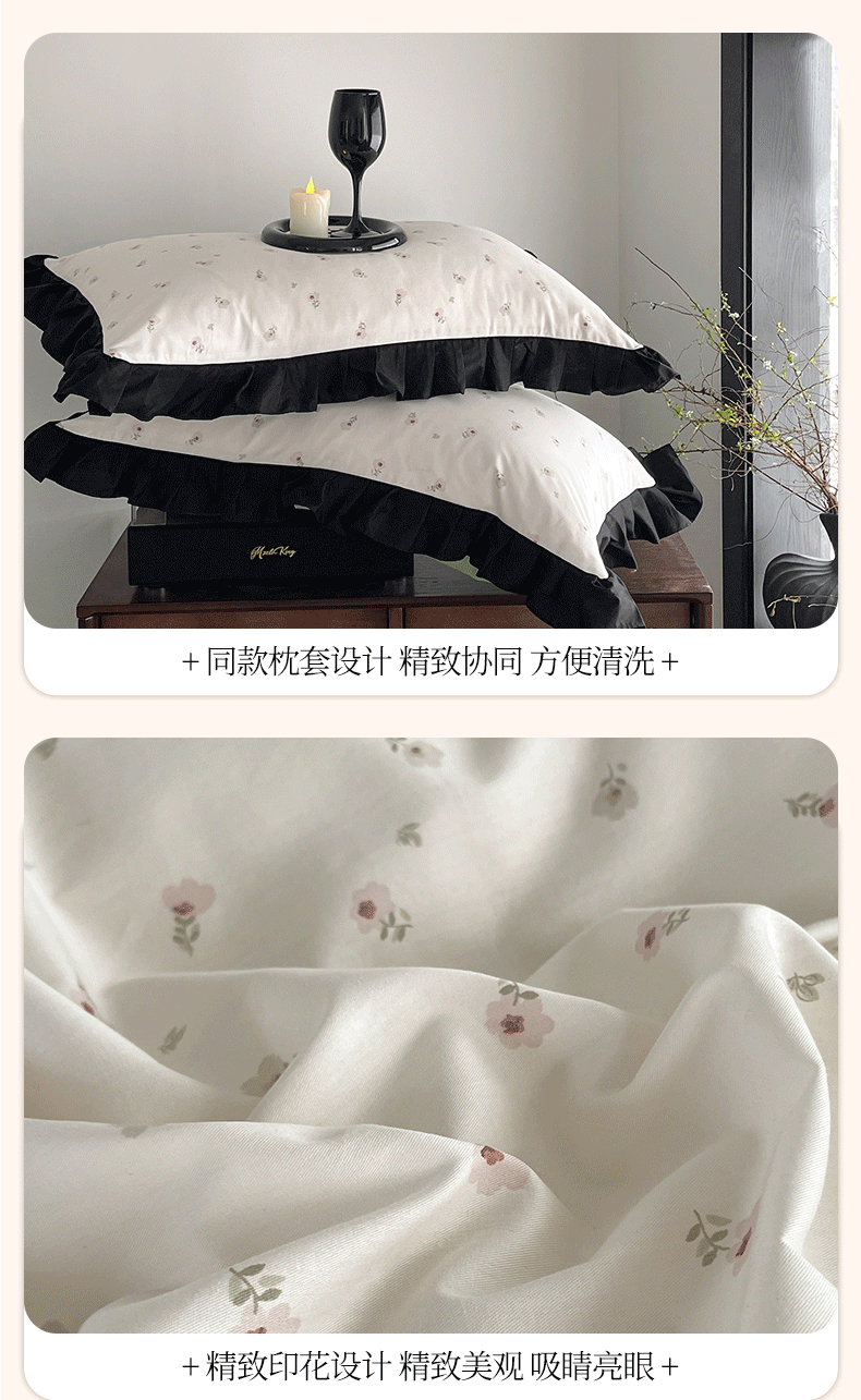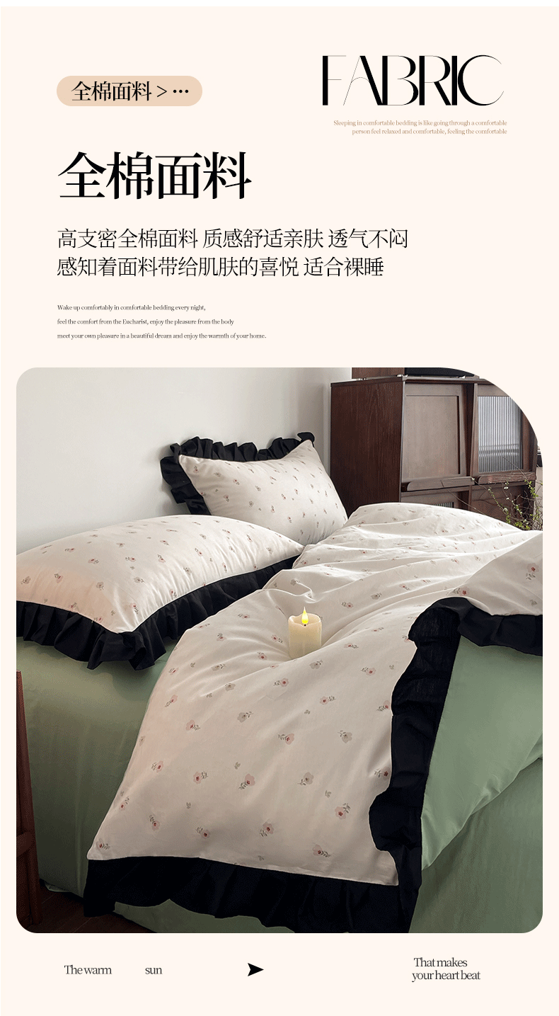 商品名称:羚羊语家纺 2026新款全棉法式赫本风花边四件套40支纯棉轻法式13372小清新喷气印花四件套被套床单床笠三件套 采薇南山