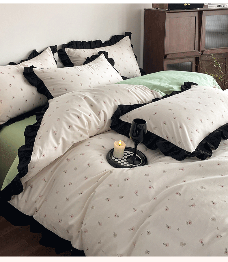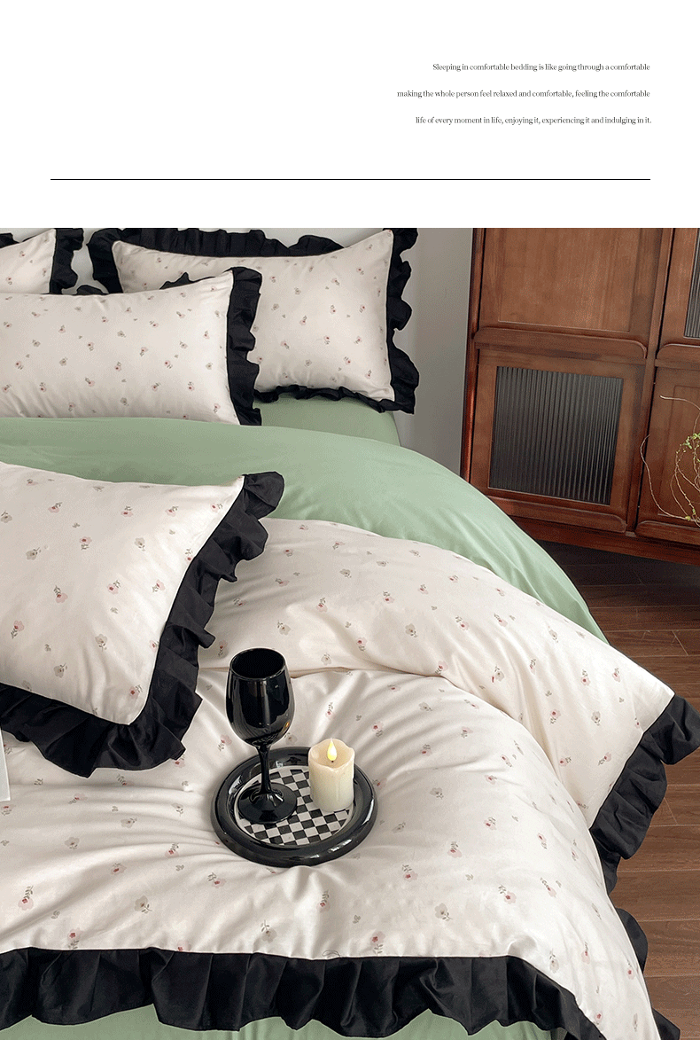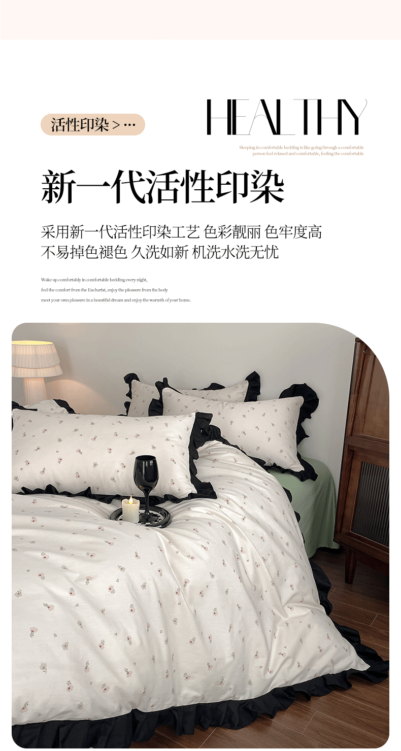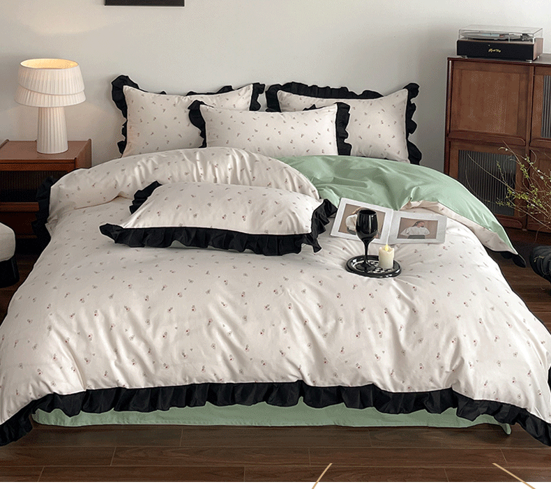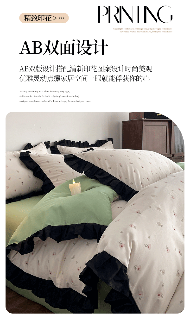 商品名称:羚羊语家纺 2026新款全棉法式赫本风花边四件套40支纯棉轻法式13372小清新喷气印花四件套被套床单床笠三件套 采薇南山