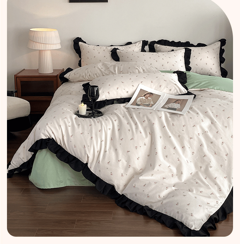 羚羊语家纺 2026新款全棉法式赫本风花边四件套40支纯棉轻法式13372小清新喷气印花四件套被套床单床笠三件套 采薇南山