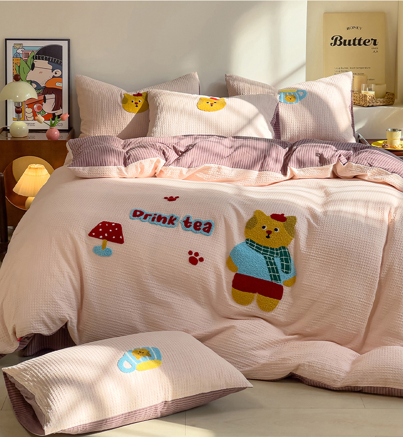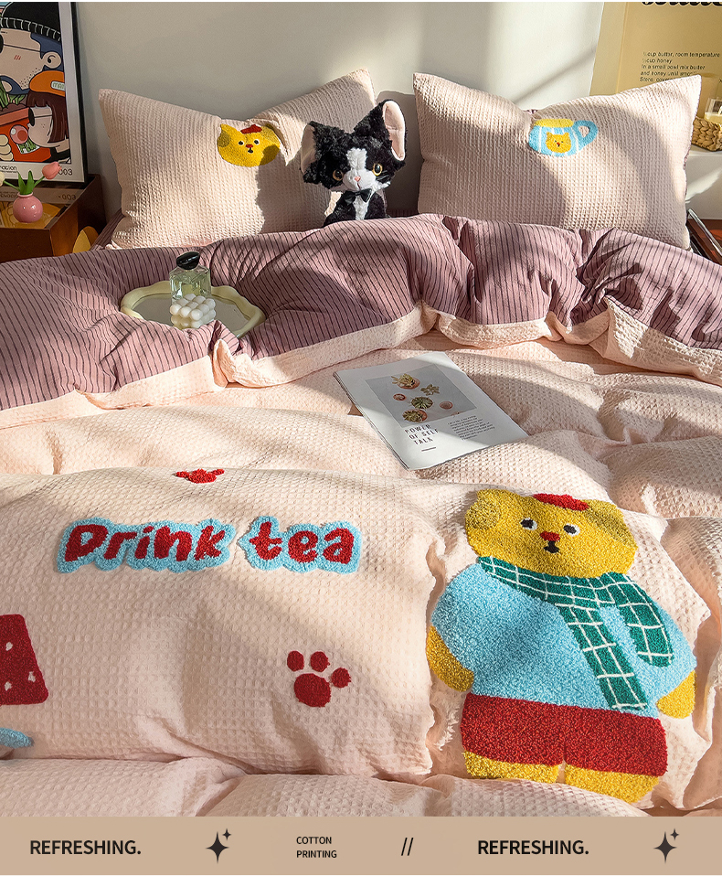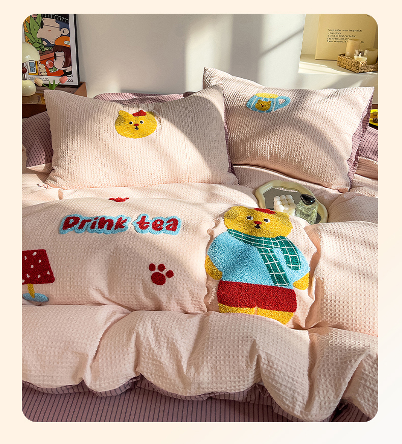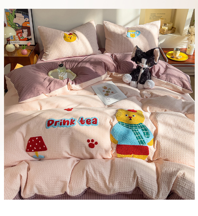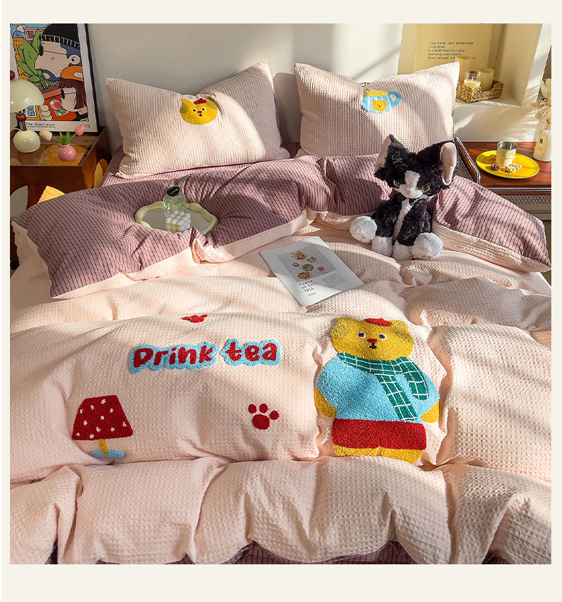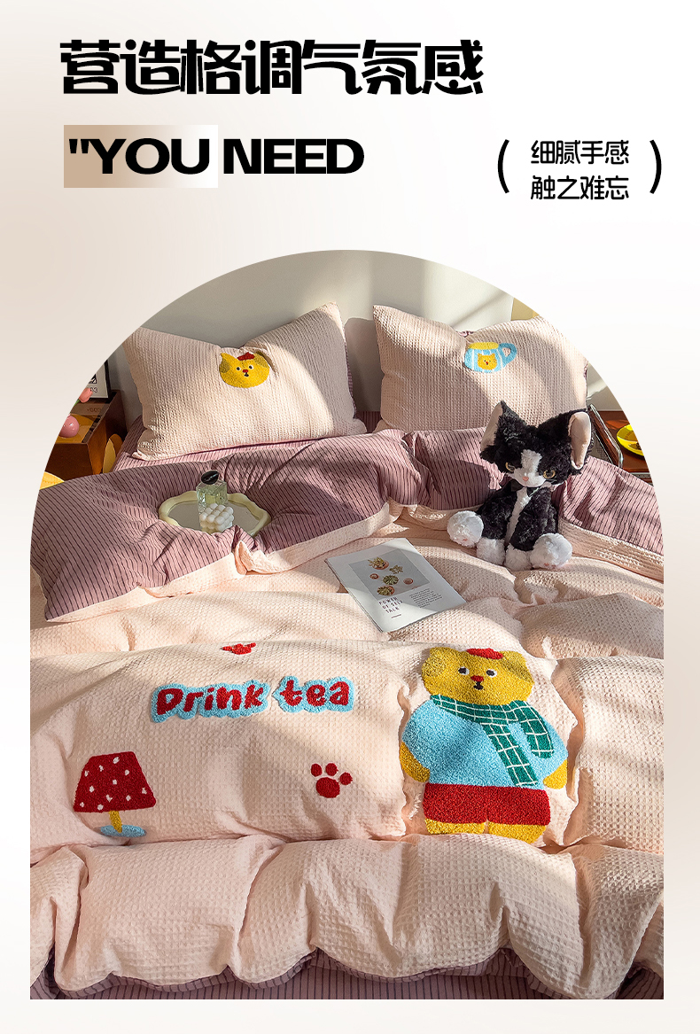 (总)炫拼家纺 2026新款A类全棉色织华夫格卡通毛巾绣B版40支纯棉水洗棉四件套-乐邦系列,乐邦-休闲熊猫,乐邦-汉堡狗,乐邦-梦想猫,乐邦-米乐兔,乐邦-苹果熊,乐邦-甜筒象