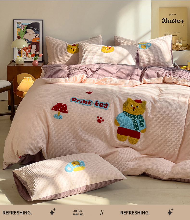 (总)炫拼家纺 2026新款A类棉麻刺绣卡通贝壳边四件套-布鲁系列,布鲁-小猫,布鲁-小熊,布鲁-小狗,布鲁-小马