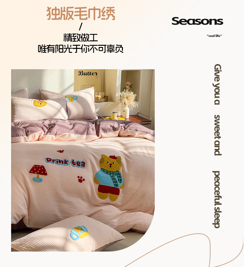 (总)炫拼家纺 2026新款A类全棉40支水洗棉毛巾绣四件套-卡通多巴胺,面包熊,快乐时光,欢乐派对,酷仔小树,快乐伙伴,潦草小狗,美猴王,惬意时光,小黑熊,一起嗨,No-1