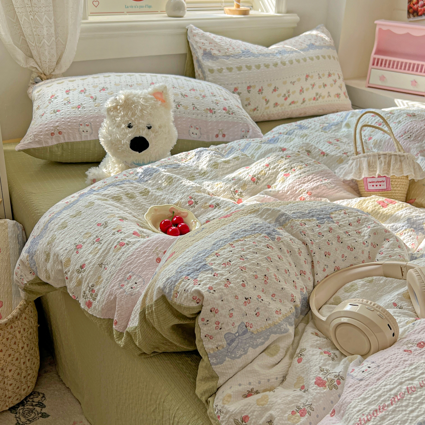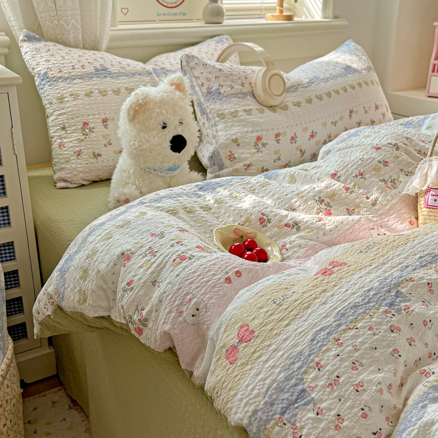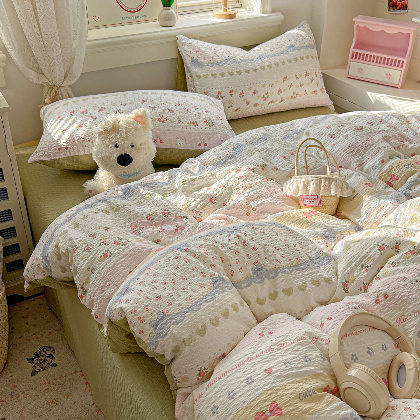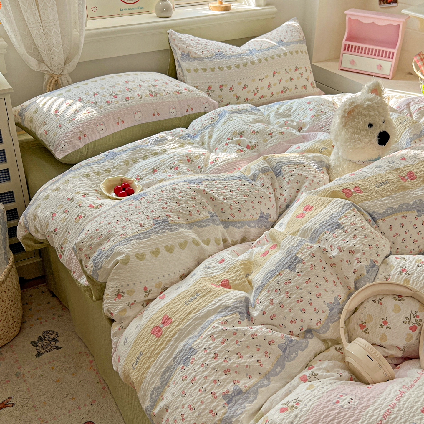 商品名称:暖伊家居 2026新款糖果小布袋泡芙纱四件套 栀夏来信