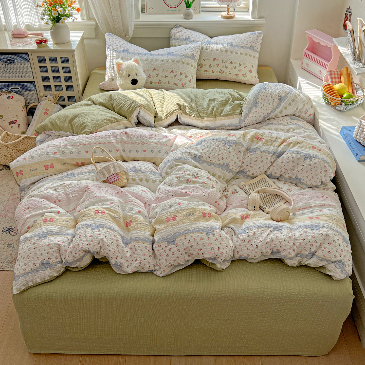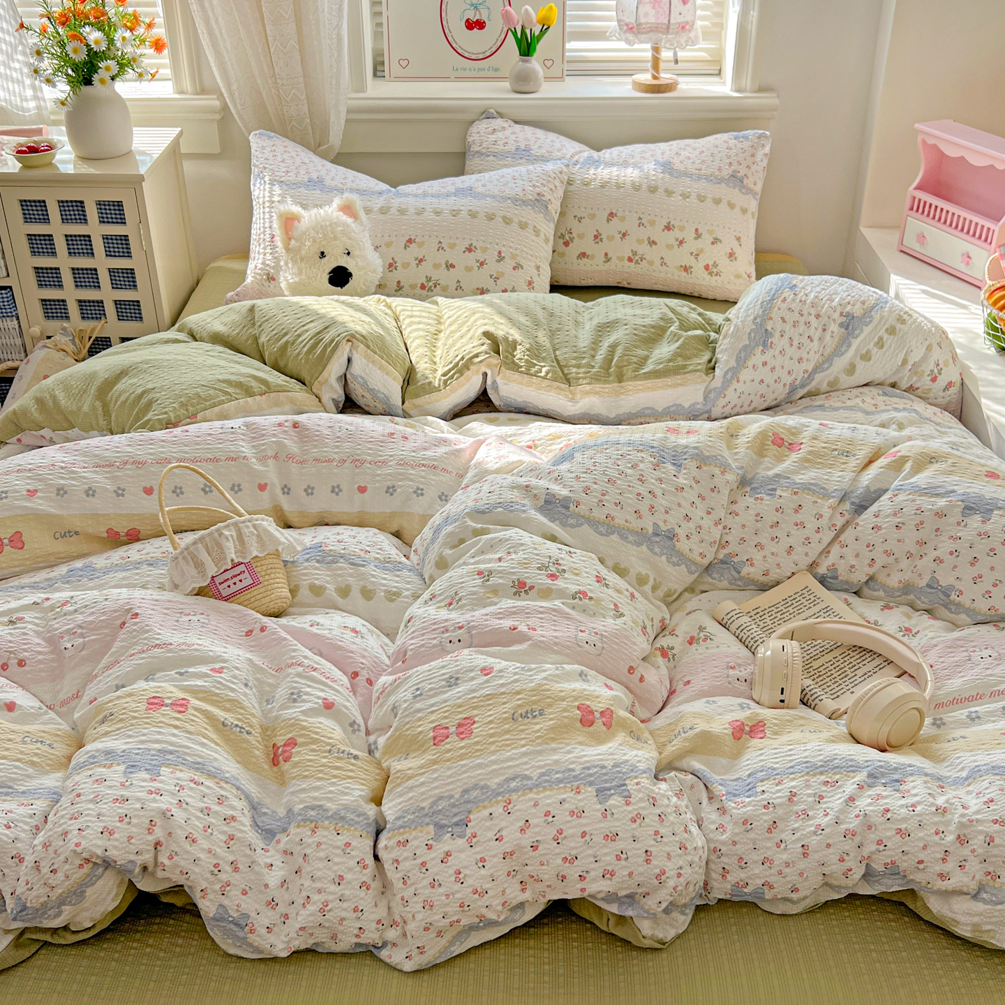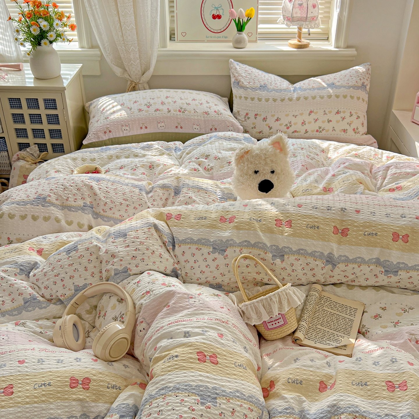 商品名称:暖伊家居 2026新款糖果小布袋泡芙纱四件套 栀夏来信