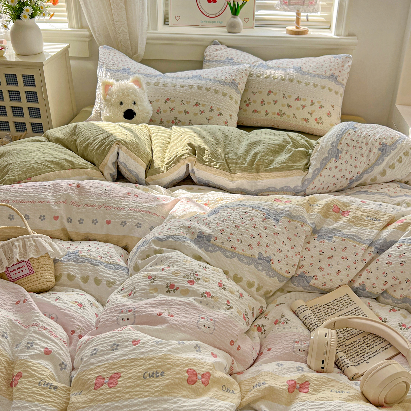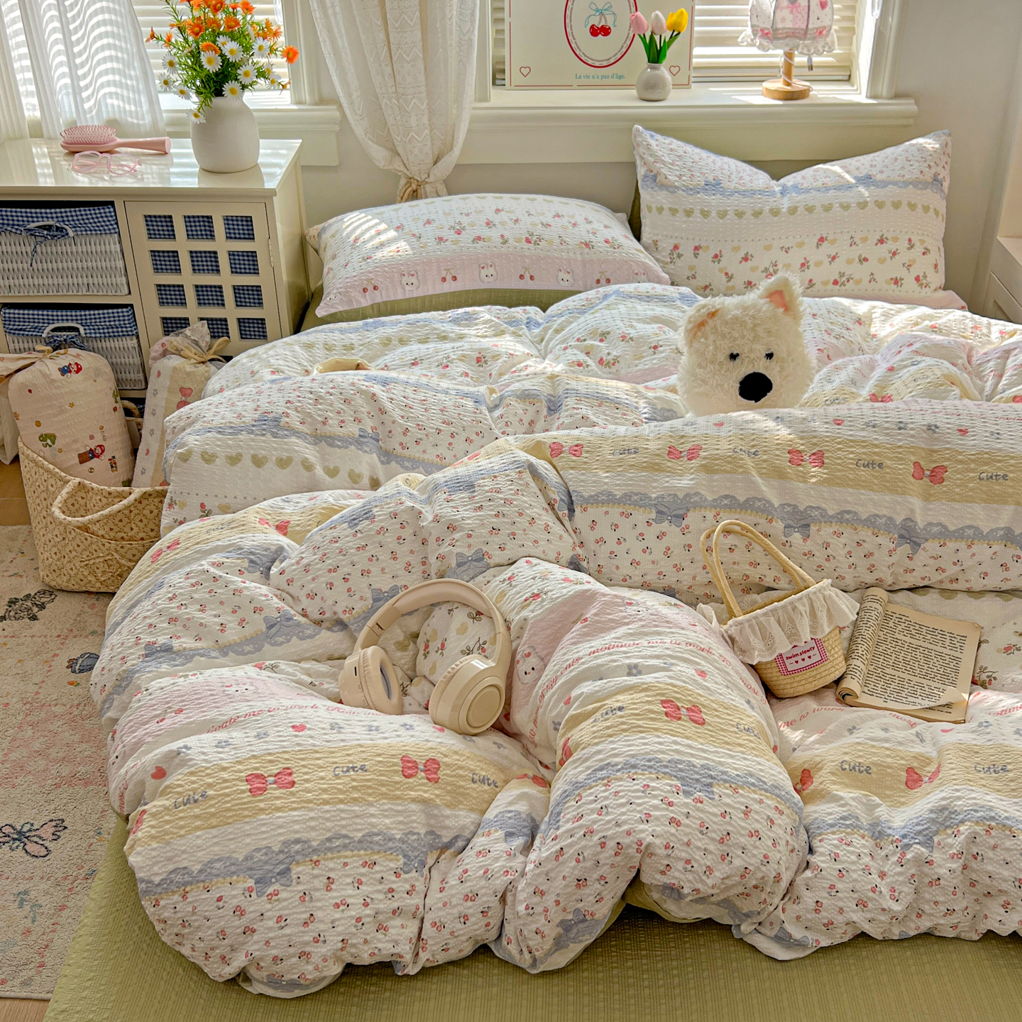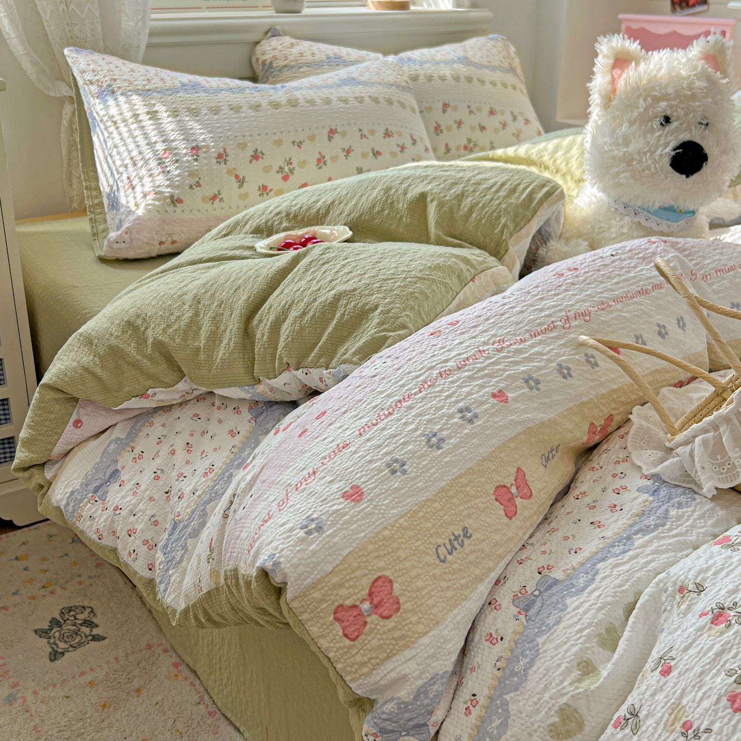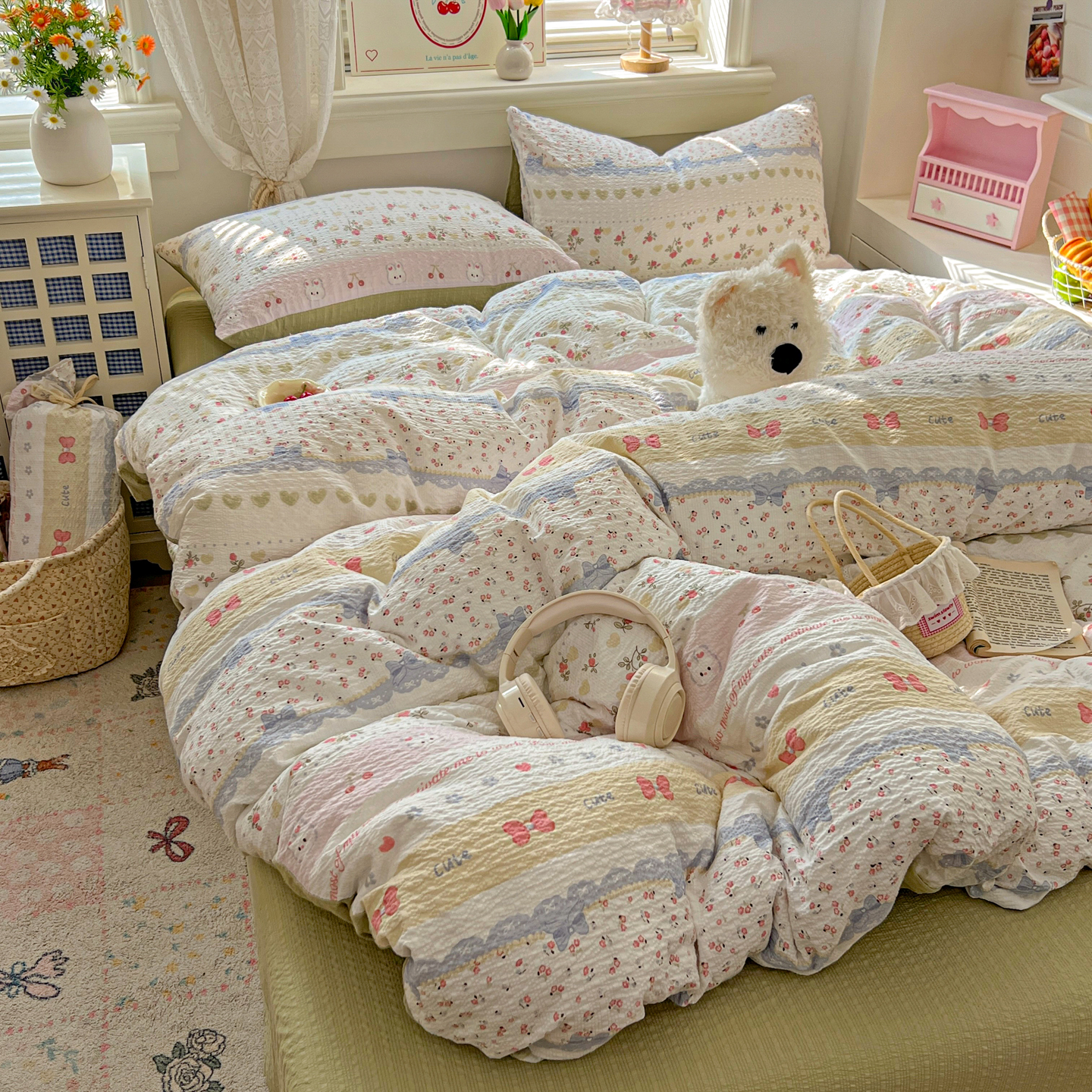 商品名称:暖伊家居 2026新款糖果小布袋泡芙纱四件套 栀夏来信
