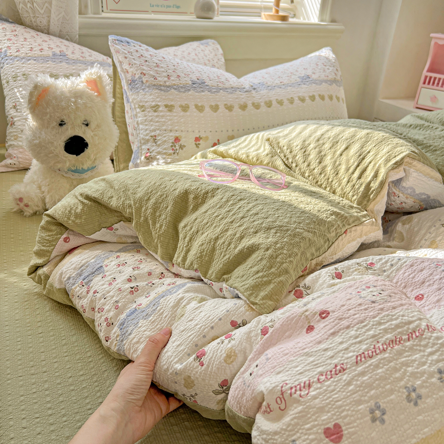 (总)暖伊家居 2026新款澳洲原单仿棉布袋四件套 硬包,腊肠狗,可可糖豆,格韵,野卉春,繁花,樱花可可,咖啡熊,芊朵,米蔷薇,清叙,樱花集,紫蝶