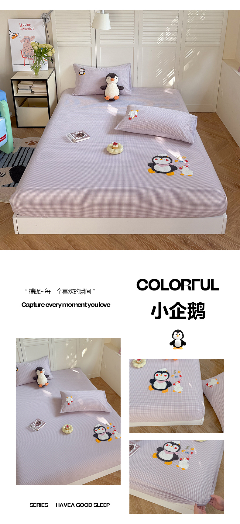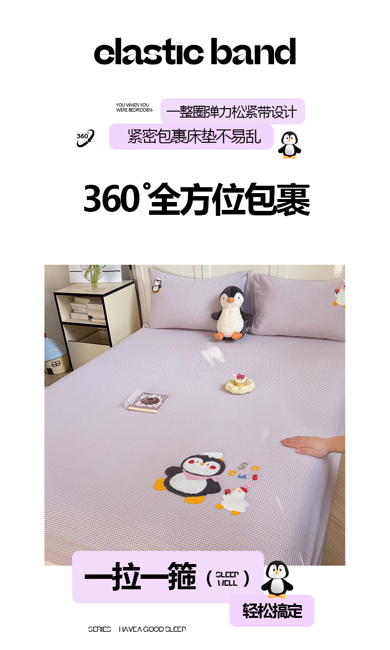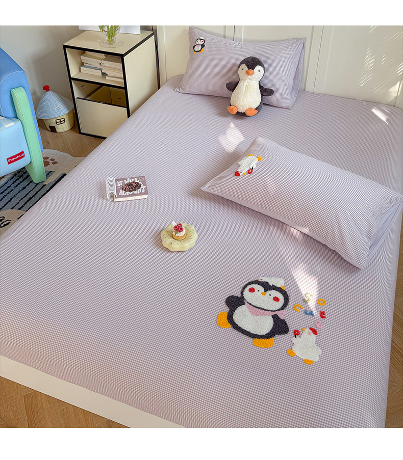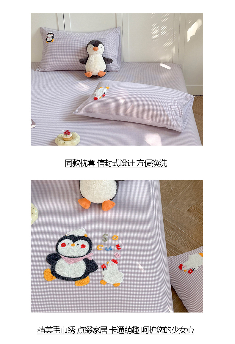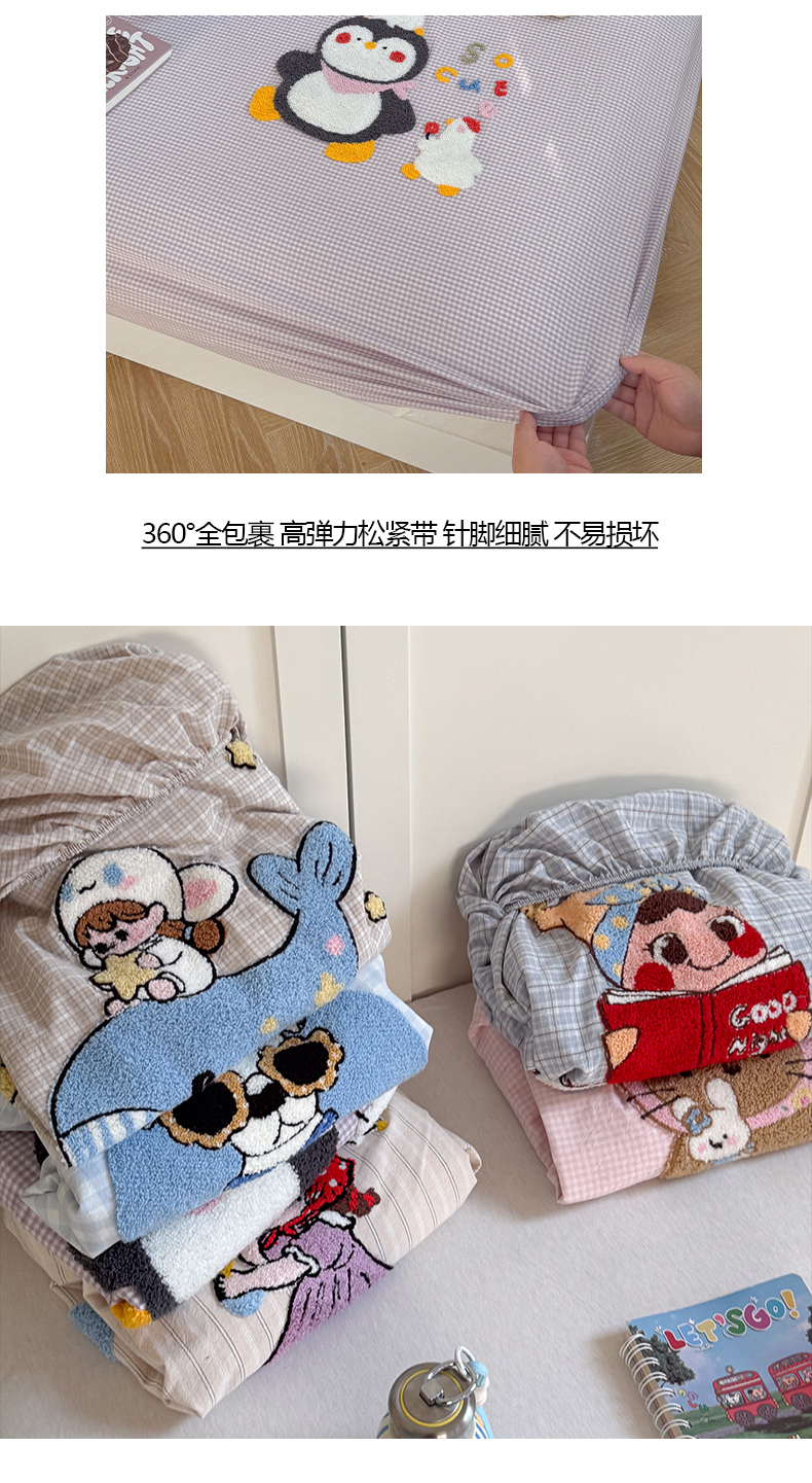 • 91家纺网 家纺一手货源 找家纺 (总)暖生活 2026新款全棉纯棉色织水洗棉毛巾绣床笠三件套,组合图仅做展示不可下单,KT日记,蓝鲸梦,墨镜小狗,下雨天,小企鹅,阅读星人