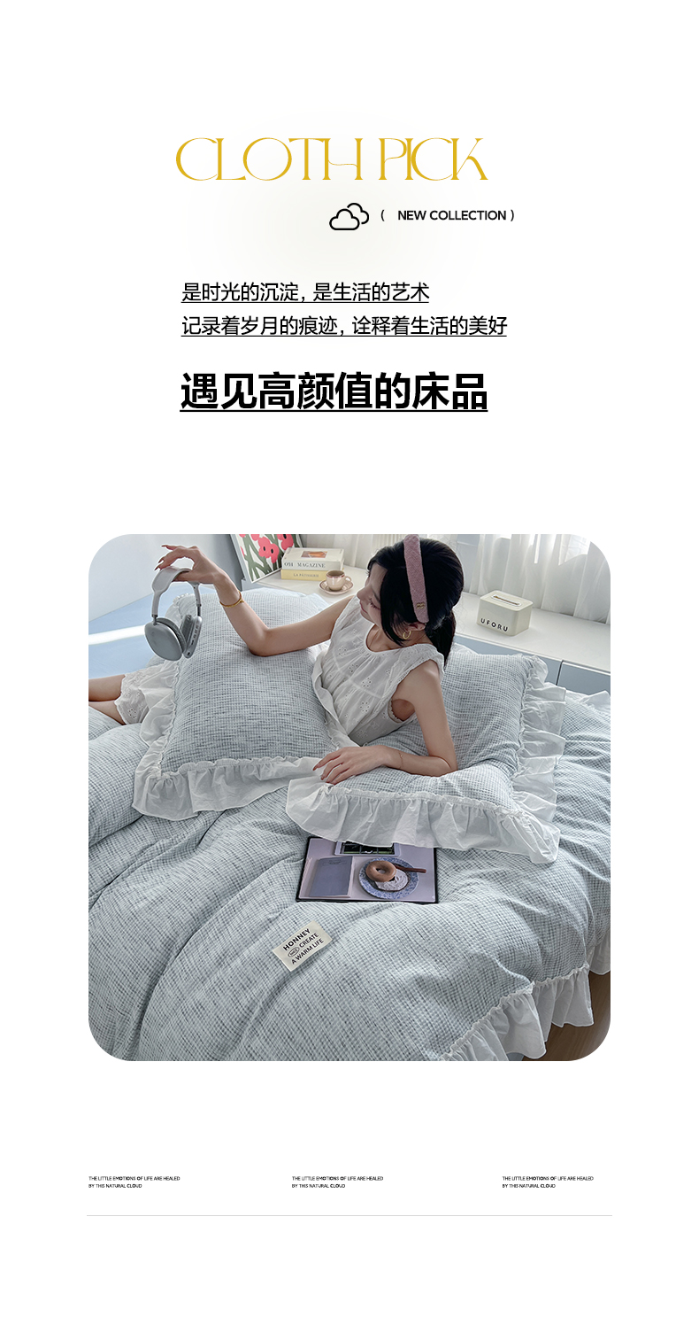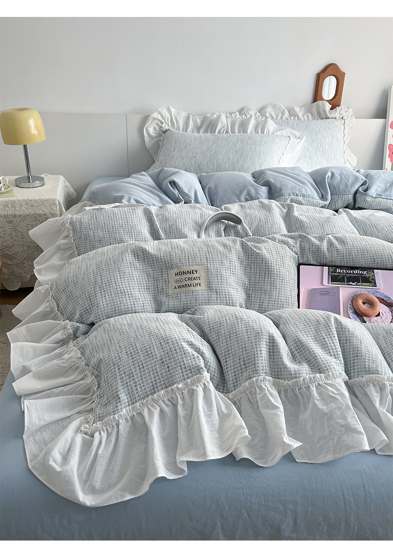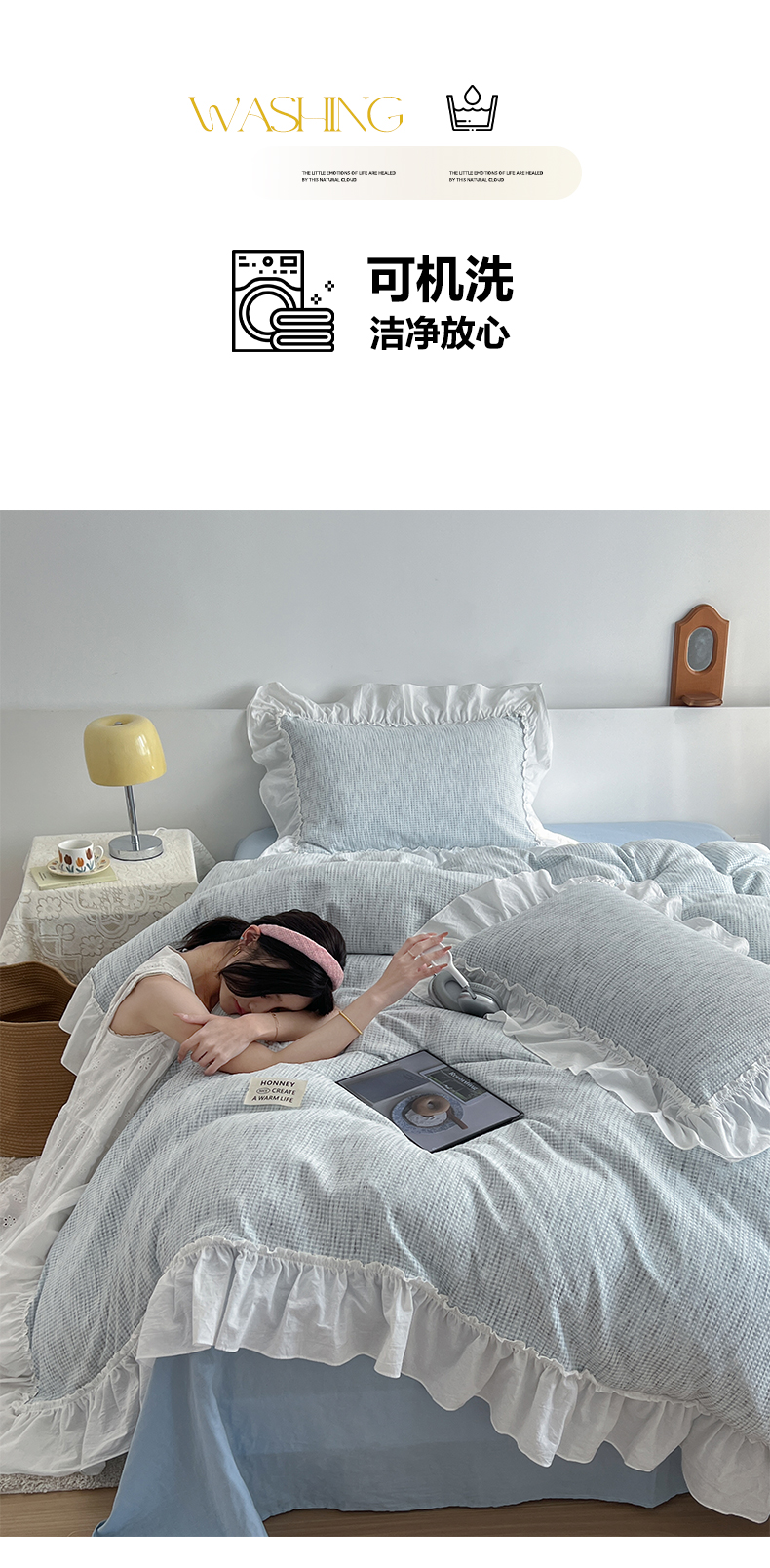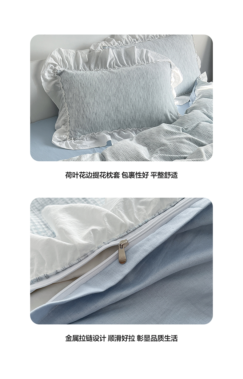 当前位置: 91家纺网 > 商品网购 > 床品套件 > 四件套 > 其它四件套 > 晨曦家纺 2026新款荷叶花边雪尼尔提花四件套可水洗棉四件套少女风 法式奶蓝