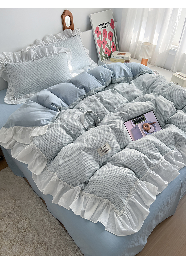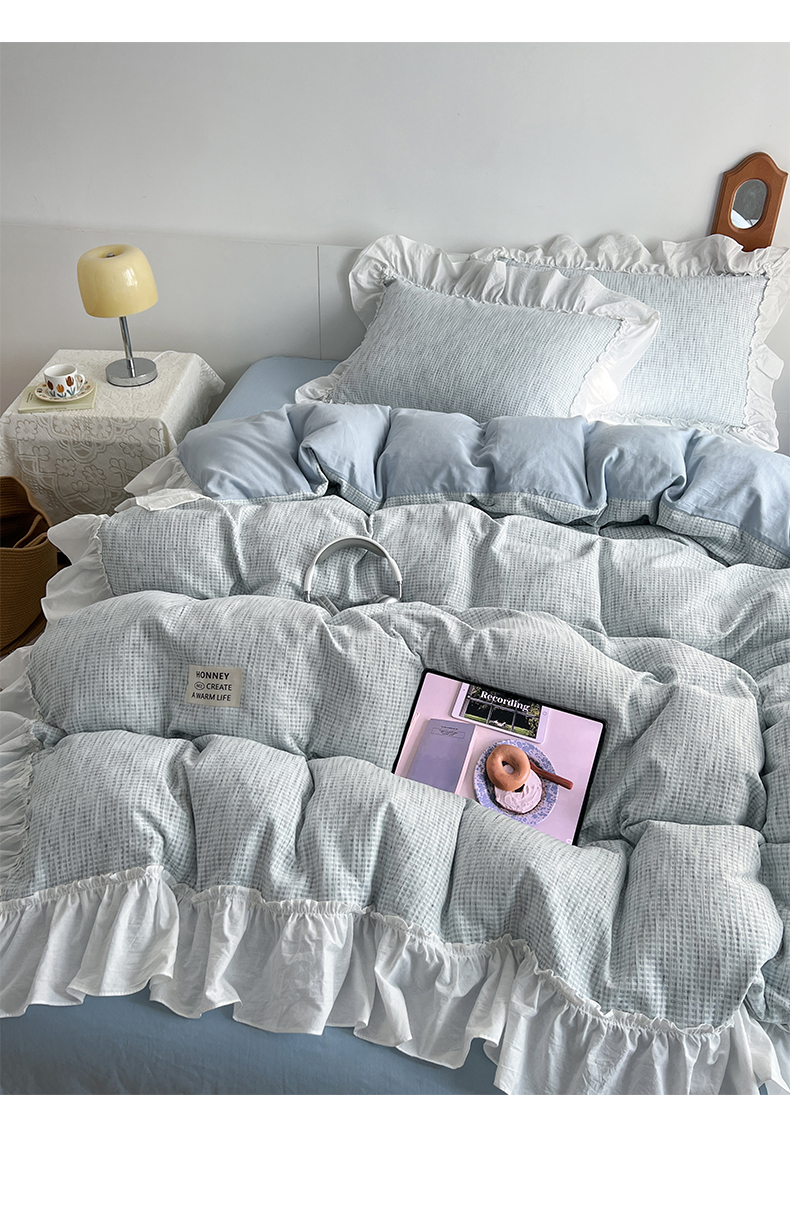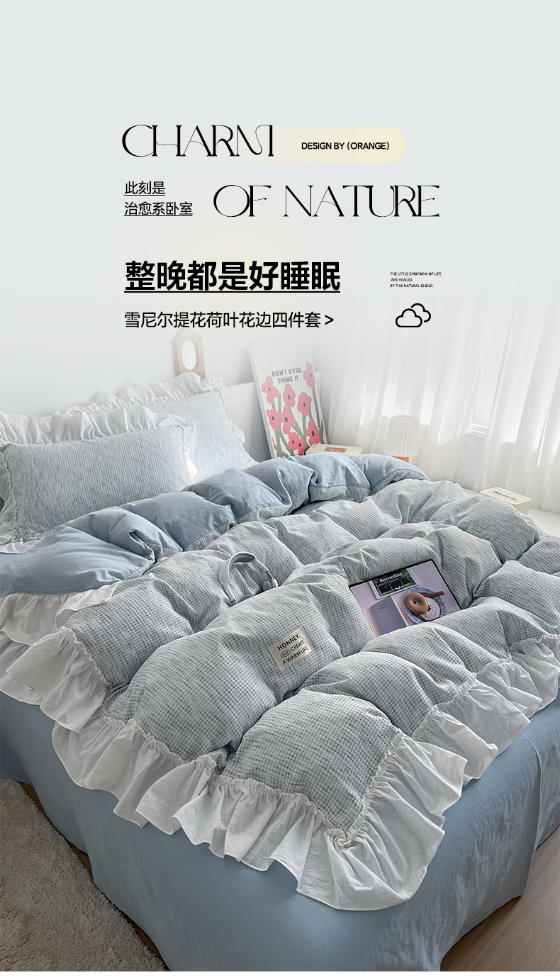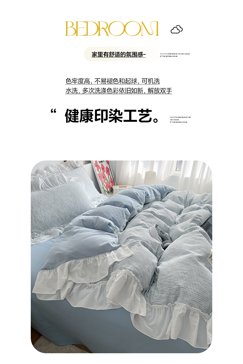 当前位置: 91家纺网 > 商品网购 > 床品套件 > 四件套 > 其它四件套 > 晨曦家纺 2026新款荷叶花边雪尼尔提花四件套可水洗棉四件套少女风 法式奶蓝
